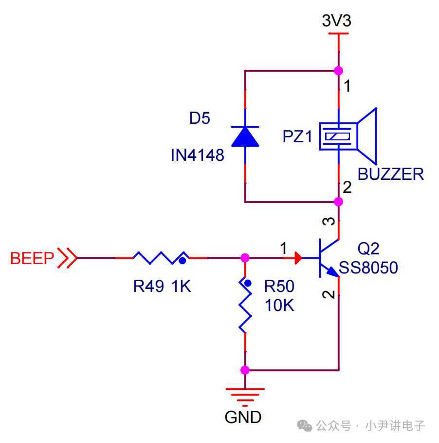 有源蜂鸣器式将直流电源转换为声音信号。 5 蜂鸣器电路设计 单片机的驱动能力较弱,需要使用三极管增加驱动能力,电路分析见下: o 当BEEP信号为高电平时。三极管SS8050的导通,蜂鸣器鸣叫。 o 当BEEP信号为低电平时。三极管SS8050的截止,蜂鸣器不鸣叫。 说明:蜂鸣器属于感性元器件,关闭时,蜂鸣器里面的电流不能突然降为0A,在突然关闭时会产生反相的电压,这时电流就需要有一个泄放路径,二极管就充当这个泄放路径。 |