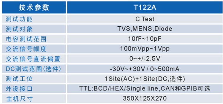 ![]() 对以上参数简单解释如下: 1)最大反向漏电流ID和额定反向关断电压VRWM。 VRWM是TVS最大连续工作的直流或脉冲电压,当这个反向电压加于TVS的两极间时它处于反向关断状态,流过它的电流应小于或等于其最大反向漏电流ID。 2)最小击穿电压VBR和击穿电流IR。 VBR是TVS最小的击穿电压。在25℃时,低于这个电压TVS是不会发生雪崩的。当TVS流过规定的1mA电流(IR)时,加于TVS两极的电压为其最小击穿电压VBR。按TVS的VBR与标准值的离散程度,可把VBR分为5%和10%两种。对于5%的VBR来说,VWM=0.85VBR;对于10%的VBR来说,VWM=0.81VBR。 3)最大箝位电压VC和最大峰值脉冲电流IPP。 当持续时间为20mS的脉冲峰值电流IPP流过TVS时,在其两端出现的最大峰值电压为VC。VC、IPP反映了TVS的浪涌抑制能力。VC与VBR之比称为箝位因子,一般在1.2~1.4之间。 4)电容量C。 电容量C是由TVS雪崩结截面决定的,是在特定的1MHz频率下测得的。C的大小与TVS的电流承受能力成正比,C太大将使信号衰减。因此,C是数据接口电路选用TVS的重要参数。TVS的结电容是根据制造工艺的不同大体分为两种内型,高结电容型,一般在几百~几千pF,和低电容型,一般几个pF。对于电源线可以不考虑,对于在数据,信号电路上应用时应选择低容值的TVS来避免信号波形畸变或引入干扰。所以像USB2.0或者其他高速接口,所用到的TVS必须是低电容的TVS。有些通讯接口要求必须低于1pf,否则将会严重影响信号质量,所以这些微小电容的测试也将直接关乎产品质量,在量产测试中也是必测项。 ![]() 测试原理虽然比较简单,但精确、快速的测出这么小的电容值,确实需要很多技术及经验的积累,目前市面上能够测试10pf以下的小电容的量产测试机非常少见,其中安捷伦的方案价格昂贵,效率偏慢,不适合量产测试。只有个别不差钱的大公司会买来用做实验室评估测试,本文为大家推荐的是一款:即适用于量产测试也非常适合实验室测试的国产电容测试机-----T122A,下图为T122A与量产测试handler联机的实物图,从图中可见,T122A的测试电路和被测器件距离非常近,这样可以大大消除了各种引线带来的干扰,能够非常准确、快速的测试出1pf以下的微小电容,其精度可达10fF,分辨率可高达1fF,同时可以实现施加偏置电压,频率也可以从0.1MHZ~~3MHZ可调,使用方便,测试效率也非常高,用下来整体效果良好,作为此测试机的使用者,强烈推荐! 如下为T122与handler的联机图,可以看出距离非常靠近被测TVS,可以排除各种干扰,从而达到精确,快速的测试出微小的电容值。 ![]() 放大的图如下: ![]() T122主机图,上图的测试机处理好的数据传输到主机端,显示结果及分BIN信息等 ![]() T122主要技术参数如下: ![]() 目前国内的半导体领域发展迅猛,国家也投入了巨大的人力、物力来促进,扶持半导体产业的发展,在半导体测试这块,国内更是一路高歌猛进,目前除了高速数字类,RF类测试机国内还在研发阶段,其他如模拟,混合信号,分立器件测试机在国内已经处于领先地位,T122是由20多年经验积累的宏邦电子自主研发的一款微小电容测试机,该设备抓住了市场痛点,完美解决了TVS,mems等需要测试10pf以下的小电容的强烈需求,目前此款机器已热销于各大封测厂,得到客户一致好评,如对此电容测试机感兴趣,可电话或微信咨询:1381654535 孙鹏程,Email:sunpengcheng@hongbangtech.com |