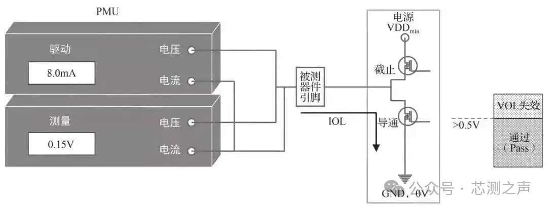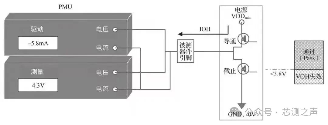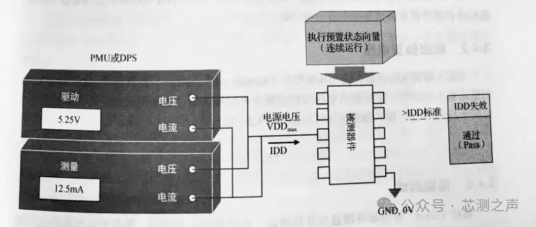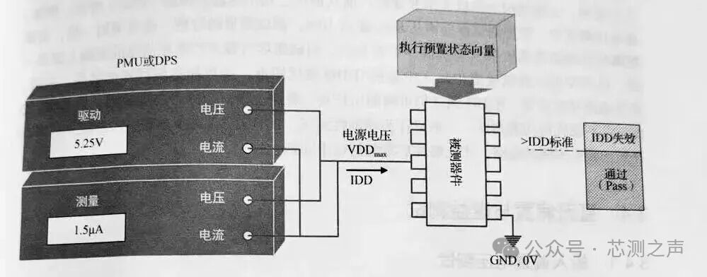 数字芯片DC参数测试详解:VIH/VIL/VOH/VOL/IOS/IDD测试原理与方法打造可靠芯片,从精准测试开始 在数字芯片的设计和制造过程中,DC参数测试是确保芯片质量的关键环节。今天我们将深入探讨数字芯片测试中VIH、VIL、VOH、VOL、IOS和IDD等核心参数的测试原理与方法。 一、DC参数测试概述 DC参数测试主要用于验证芯片在不同状态下的电流、电压和阻抗特性,确保其符合设计规格要求。对大多数DC参数来说,实质上是在测试半导体的电阻特性,而解释这种特性用的是欧姆定律。 通过DC测试,我们可以判断芯片是否存在物理缺陷(如引脚短路、bond wire缺失、静电损坏等),也可以评估芯片的功耗、驱动能力等关键指标。 二、输入电平阈值测试:VIH与VIL 测试目的 VIH(输入高电平)是输入引脚正确识别为逻辑1的最小电压;VIL(输入低电平)是输入引脚正确识别为逻辑0的最大电压。这两个参数确保了芯片能正确识别输入信号。 测试方法(加流测压,FIMV) 测试时,在规定温度下将芯片放入测试平台,将所有IO置为输入状态,分别在VDDmax和VDDmin模式下验证VIL和VIH。 具体操作是:通过测试仪器施加规定的输入电流,然后测量对应的电压值,确保在输入电流下电压值符合逻辑电平识别要求。 示例:对于典型的CMOS器件,VIH通常是0.7×VDD,VIL通常是0.3×VDD。这意味着在5V供电系统中,VIH约为3.5V,VIL约为1.5V。 三、输出驱动能力测试:VOH与VOL 测试目的 VOH(输出高电平)表示引脚输出逻辑1时的最低电压;VOL(输出低电平)表示引脚输出逻辑0时的最高电压。它们共同衡量的是引脚Buffer在输出高电平或低电平时的阻抗。 测试方法 VOH/IOH测试:先将待测引脚设置为高电平输出,向引脚施加恒定的IOH(输出高电平电流),等待1-5毫秒后测量电压值。如果测得电压低于VOH规格,则测试失败。 VOL/IOL测试:先将待测引脚设置为低电平输出,向引脚施加恒定的IOL(输出低电平电流),同样等待稳定后测量电压。如果电压高于VOL规格,则测试失败。 注意事项 测试时需要设置电压钳位,防止电压异常损坏测试设备。同时要注意,IOL是正值(电流从PMU流向DUT),而IOH是负值。 四、短路输出电流测试:IOS 测试目的 IOS(短路输出电流)衡量当引脚输出高电平但被短路至低电压时的输出阻抗,确保在最坏负载条件下输出电流不会过大。这也表示了DUT引脚可提供容性负载充电的最大瞬时电流。 测试方法 先给芯片施加VDDmax电压,通过预处理使引脚输出高电平。然后用PMU将引脚拉低至0V,测量输出电流并与标称值对比。 安全注意事项:IOS测试需要特殊的保护逻辑以避免热切换。测试时间必须极短(通常不超过1秒),且一次只能测试一个输出引脚,防止芯片过热损坏。 典型规格 五、电源电流测试:IDD 测试目的与分类 IDD表示的是CMOS电路中从漏极(D)到漏极(D)的电流(TTL电路中称为ICC)。IDD测试分为三种类型: 1. Gross IDD:粗略测试,用于快速筛选功耗过大的缺陷芯片 2. 静态IDD:测量芯片在非活动状态下的功耗 3. 动态IDD:测量芯片在最大工作频率下的功耗 Gross IDD测试 Gross IDD测试是芯片上电后的第一个测试,目的是判断能否继续测试DUT。如果Gross IDD测试不通过(电流过大),就停止后续测试。 测试方法:通过重置将所有输入引脚设低/高电平(VIL设置为0V、VIH设置为VDD),所有输出引脚空载,然后测量流入VDD引脚的总电流。 静态IDD测试 静态IDD测试测量的是流入VDD引脚的总电流,需要DUT运行在最低功耗模式下。与Gross IDD的区别是,静态IDD测试已有预处理程序,通过预处理后再进行测试。 IDDQ测试:这是静态IDD的一种特殊形式,测量CMOS电路中所有管子都处于静止状态时的电源总电流,用于提升测试覆盖率。 动态IDD测试 动态IDD测试的是DUT在动态执行功能时(通常为最大工频)消耗的电流,确保其不超过标称值。 测试方法:用PMU或DPS在器件在最高工作频率时运行一段连续的测试向量,测量流入VDD引脚的总电流,与规格书对比。 六、测试实例与故障排查 典型测试流程 1. 开短路测试(Open-Short Test) 2. Gross IDD测试 3. 功能测试 4. 其他DC参数测试(VIH/VIL/VOH/VOL等) 5. 静态/动态IDD测试 常见故障排查 当IDD测试出现异常时,建议按以下步骤排查: 1. 先用万用表测量是否有短路,检查Socket上电到地后的电阻 2. 检查电源端电压是否被下拉 3. 检查旁路电容是否适当 4. 确认芯片与测试座的接触良好 重要提示:测试不通过时,应先排除非器件问题。将器件从Socket取走,空跑程序,电流应为0。如果不是,说明测试系统本身存在问题。 DC参数测试是数字芯片测试的基础,直接关系到芯片的性能和可靠性。通过精确测量VIH、VIL、VOH、VOL、IOS和IDD等参数,我们可以全面评估芯片的输入输出特性、驱动能力和功耗性能。 随着芯片工艺的不断进步,DC测试技术也在持续发展,未来将面临更多挑战和机遇。掌握这些基础测试原理和方法,对于芯片设计、测试和应用工程师都至关重要。 这是一个非常专业且切中要害的问题。在芯片测试中,对输入/输出缓冲器(I/O Buffer)进行测试时,特别是测试其驱动强度(通常称为IOS,I/O Short Circuit Current),将VDD设置为最大值(VDDmax)是至关重要的。这背后的原理涉及最坏情况测试、设计余量验证和可靠性保证。 以下是详细的原因分析: 一、核心原因:创造最严苛的测试条件 芯片的规格书(Datasheet)中给出的参数(如IOS)必须保证在所有允许的电源电压范围内都满足要求。因此,测试必须在最坏情况下进行,