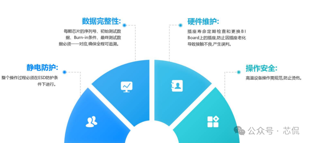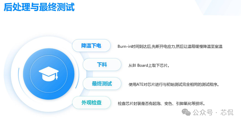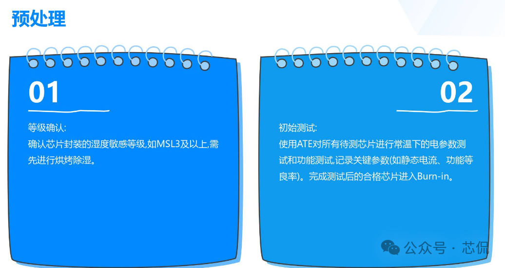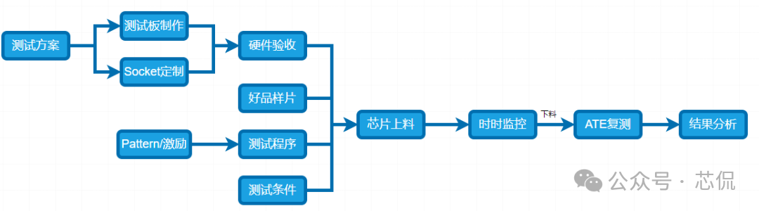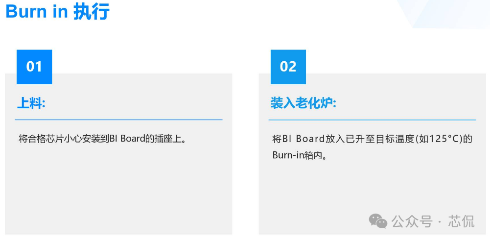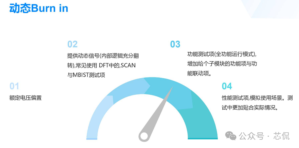 芯片产品中的Burn in 测试方案分如下几个步骤:一, Burn-in测试方案与流程 根据产品的特性与需求,制定一套完整的BI测试方案 实现芯片所需验证到的功能,主要方案需求如下: 主要流程: ![]() 二,测试目的 建立标准化的Burn-in测试流程,通过施加高温和偏压应力,加速芯片内部潜在的缺陷(如氧化层缺陷、金属电迁移、接触不良等)失效。 ![]() 三,老化炉选型与硬件开发 小功耗芯片,使用总体控制温度的老化箱即可。 大功耗芯片,需要进行独立温控,在最接近芯片的附近增加温度传感器与加热棒。方便时时调整芯片的温度,满足结温要求。对老化炉的选择更加多样性。可以是老化炉,也可以是敞开式的老化设备。 箱式老化设备图一 硬件开发流程与大致周期: ![]() 四,主要老化方案 静态Burn in 只给芯片施加额定电压偏置,但不提供动态信号。常见最大额定工作电压的1.1 ~ 1.2倍。芯片内部电路不进行开关操作(常见于军工级的一道老化测试流程)。 如: 额定电压为1.8V的芯片,可施加1.98V进行Burn-in。 ![]() 动态功耗第一,二项必备, 三四项根据产品要求可选。 五,设备要求 ![]() 六,测试流程 ![]() ![]() ![]() ![]() 七,判断失效标准 终点测试中失效:任何电参数(如漏电流、驱动能力、功能)超出初始测试的规格范围。与初始测试值相比,参数漂移超过规定的百分比(如超过50%) 外观检查失效:封装出现任何物理损伤。 失效分析:所有失效芯片必须进行失效分析,使用显微镜、X-Ray、开封,SEM/EDS等技术定位失效点,确定失效模式(EOS/ESD、工艺缺陷、设计缺陷等),并反馈给设计和工艺部门。 八,可靠性数据计算 ![]() 九,注意事项 芯片的Burn-in是一个高度专业化和标准化的过程,是确保芯片交付高可靠性的关键步骤。Burn in方案需根据芯片的工艺、设计和应用场景进行参数细化。 |