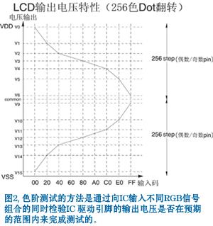 这是彩色(灰度)LCD Driver IC最重要的测试项目,由液晶器件的显示原理可知,LCD显示器件的色彩表现是通过向LCD面板加不同的电压来实现的,因此测试的方法就是在向IC输入不同RGB信号组合的同时检验IC 驱动引脚的输出电压是否是在预期的范围内来完成测试的,如图2所示。