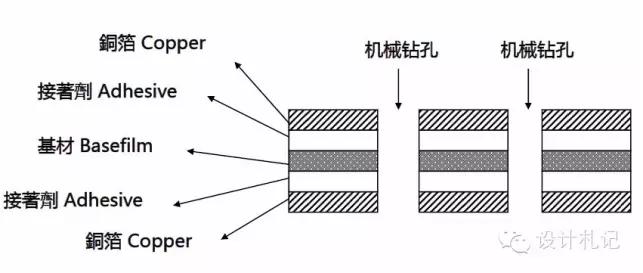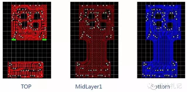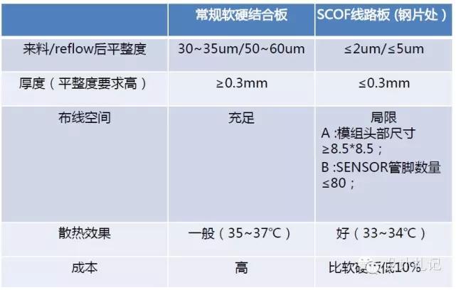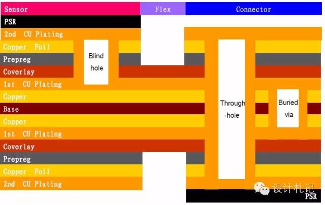 分以下5个方面给大家介绍: 1.线路板简介 2.线路板材料介绍 3.线路板基本叠构 4.线路板制作流程 5.线路板案例分享 1.挠性印制电路板 挠性印制电路板(FlexPrintCircuit,简称“FPC”),是使用挠性的 基材制作的单层、双层或多层线路的印制电路板。它具有轻、薄、短、小、高 密度、高稳定性、结构灵活的特点,除可静态弯曲外,还能作动态弯曲、卷曲和折叠等。 2.刚性印制电路板 刚性印制电路板(PrintedCircuieBoard,简称“PCB”),是由不易变形 的刚性基板材料制成的印制电路板,在使用时处于平展状态。它具有强度高 不易翘曲,贴片元件安装牢固等优点。 3.软硬结合板 软硬结合板(RigidFlex),是由刚挠和挠性基板有选择的层压在一起组 成,结构紧密,以金属化孔形成电气连接的特殊挠性印制电路板。它具有高 密度、细线、小孔径、体积小、重量轻、可靠性高的特点,在震动、冲击、 潮湿环境下其性能仍很稳定。可柔曲,立体安装,有效利用安装空间,被广 泛应用于手机、数码相机、数字摄像机等便携式数码产品中。刚-柔结合板 会更多地用于减少封装的领域,尤其是消费领域。 2线路板材料介绍 1、 导电介质:铜(CU) ﹣铜箔:压延铜(RA)、电解铜(ED)、高延展性电解铜(HTE) ﹣厚度:1/4OZ、1/3OZ、1/2OZ、1OZ、2OZ,此为较常见的厚度 ﹣OZ(盎司):铜箔厚度单位;1OZ = 1.4 mil 2、绝缘层:聚酰亚胺(Polyimide)、聚脂(Polyester)、聚乙稀萘(PEN) ﹣较常用的为聚酰亚胺(简称“PI”) ﹣PI厚度:1/2mil、1mil、2mil,此为较常见的厚度 ﹣1 mil = 0.0254mm = 25.4um = 1/1000 inch 3、 接着剂(Adhesive):环氧树脂系、压克力系。 ﹣较为常用的是环氧树脂系,厚度跟据不同生产厂家的不同而不定 4、覆铜板(Cucladlaminates,简称“CCL”): ﹣单面覆铜板:3LCCL(有胶)、2LCCL(无胶),以下为图解。 ﹣双面覆铜板:3LCCL(有胶)、2LCCL(无胶),以下为图解。 5、覆盖膜(Coverlay ,简称“CVL”) :由绝缘层和接着剂构成,覆盖于导线上, 起到保护和绝缘的作用。具体的叠层结构如下 2、导电银箔:电磁波防护膜 ﹣类型:SF-PC6000(黑色,16um) ﹣优越性:超薄、滑动性能与挠曲性能佳、适应高温回流 焊、良好的尺寸稳定性。 常用的为SF-PC6000,叠层结构如下: 3Rigid-Flex叠构展示 4线路板制作流程 1,开料:裁剪 Cutting/Shearing 2,机械钻孔CNCDrilling 3,镀通孔PlatingThroughHole 4,DES制程(五部曲) (1).贴膜(贴干膜) (2).曝光 作业环境:黄光 作业目的:通过UV光照射和菲挡,菲林透明的地方和干膜发生光学聚合 反应,菲林是棕色的地方,UV光无法穿透,菲林不能和其对 应的干膜发生光学聚合反应。 (3).显影 作业溶液: Na2CO3(K2CO3)弱碱性溶液 作业目的:用弱碱性溶液作用,将未发生聚合反应之干膜部分清洗掉 (4).蚀刻 作业溶液:酸氧水:HCl+H2O2 作业目的:利用药液将显影后露出的铜蚀刻掉,形成图形转移。 (5).剥膜 作业溶液:NaOH强碱性溶液 5、AOI 主要设备:AOI、VRS系统 已形成线路的铜箔要经过AOI系统扫描检测线路缺失。标准线路图像信息以数据形式存储于AOI主机中,通过CCD光学取像头将铜箔上线路信息扫描进入主机与存储之标准数据比较,有异常时异常点位置会被编号记录传输到VRS主机上.。VRS上会对铜箔进行300倍放大,依照事先记录的缺点位置依次显示,通过操作人员判断其是否为真缺点,对于真缺点会在缺点位置用水性笔作记号。以方便后续作业人员对缺点分类统计以及修补。作业人员利用150倍放大镜判断 缺点类型,分类统计形成品质报告,并反馈到前制程以方便改善措施之及时执行。由于单面板缺点较少,成本较低,难于使用AOI判读,所以使用人工肉眼直接检查。 6、假贴 保护膜作用:1)绝缘、抗焊锡作用; 2)保护线路; 3)增加软板的可挠性等作用。 7、热压合 作业条件:高温高压 8、表面处理 热压完后,需对铜箔裸露的位置进行表面处理。 方式依据客户要求而定 9、丝印 主要设备:网印机.烤箱.UV干燥机.网版制版设备通过网印原理将油墨转到产品上.主要印刷产品批号,生产周期,文字,黑色遮蔽,简单线路等内容.通过定位PIN将产品与网版定位,通过刮刀压力将油墨挤压到产品上.网版为文字和图案部分部 分开通,无文字或图案部分被感光乳剂封死油墨无法漏下.印刷完毕后,进入烤箱烘干,文字或图案印刷层就紧密结合在产品表面.一些特殊产品要求有部分特殊线路,如单面板上增加少许线路实现双面板功能,或是双面板增加一层遮蔽层都必须通过印刷实现. 如油墨为UV干燥型油墨,则必须使用UV干燥机干燥.常见问题:漏印、污染、缺口、突起、脱落等. 10、测试(O/S检测) 测试治具+测试软件对线路板进行功能全检 11、冲制 相应的外形膜具:刀膜、激光切割、蚀刻膜、简易钢模、钢模 12、加工组合 加工组合即根据客户要求组装配料,如要求供应商组合的有: A.不锈钢补强 B.铍铜片/磷铜片/镀镍钢片补强 C.FR4补强 D.PI补强 13、检验 检验项目:外观、尺寸、可靠性 检测工具:二次元、千分尺、卡尺、放大镜﹑锡炉﹑拉力 14、包装 作业方式:1.塑胶袋+纸板 2.低粘着包材 3.制式真空盒 4.专用真空盒(抗静电等级) 双面PCB板制作流程图 软硬结合板制作流程图 5线路板案例分享 一、设计方案 1.方案说明: • 新型COF方案,是补强与芯片贴附区域在一体式钢片上,见FPC示意图。 • 主要的用途: • 1.让sensor尽量减少与不平整的线路板的表面贴合,直接将sensor与平整的钢片表 面贴合,使sensor与光学镜头的光轴垂直,减少像糊不