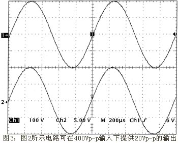 图3示出了输入为400Vp-p的放大器性能(上迹线)以及相应的20V输出(下迹线)。图4所示的交叉曲线则显示50V/格输入信号与5V/格输出信号的线性度。图5所示的线性误差曲线表示了非线性度与400Vp-p输入信号的关系。