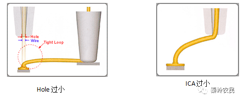1)Hole:hole过小,金线在键合过程中放线不顺畅,导致线弧过紧。 2)ICA:ICA过小,键合过程中易伤线。