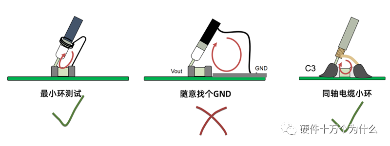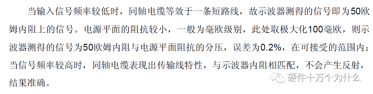 芯片的供电环路从稳压模块VRM开始,到PCB的电源网络,芯片的ball引脚,芯片封装的电源网络,最后到达die. 当芯片工作在不同负载时,VRM无法实时响应负载对电流快速变化的需求,在芯片电源电压上产生跌落,从而产生了电源噪声。对于电源会产生和开关频率一致的电源纹波,始终叠加在电源上输出。 如图所示输出电压的波形,包含开关的纹波,负载跳变的引起的跳变,还有耦合进来的噪声。 测量输出的纹波时,应将探头放置于输出电容处,避免噪声的耦合。在没有负载跳变时,可以限制带宽,得到比较干净的纹波波形。 测试波形如下图: 为避免过多的噪声耦合到纹波测试,应用尽可能小的环路,避免耦合的噪声过大。一般的示波器探头不能直接使用,需用专用示波器探头或者使用同轴电缆小环;并且测量点应在电源输出端上,若测量点在负载上则会造成极大的测量误差。 测量输出的纹波时,应将探头放置于输出电容处,避免噪声的耦合。在没有负载跳变时,可以限制带宽,得到比较干净的纹波波形。 噪声的来源 电源纹波和电源噪声是两种不同类型的电源问题,它们有着不同的特征和来源。 电源纹波: · 定义:电源纹波是指电源输出中的交流波动或波纹。它是由电源本身的设计、负载变化或其他外部因素引起的。 · 特征:通常以毫伏(mV)为单位进行测量。纹波是在直流电平上的小幅波动,其频率可以因电源设计、交流干扰等原因而异。 · 来源:开关电源本身的开关特性形成的。开关电源的纹波是指,叠加在开关电源输出电压上,频率与开关频率一致的交流量,其产生原因是开关电源的电流纹波作用在电容的ESR上。 · 影响:电源纹波若超出规定范围可能影响电子设备的正常运行,尤其对于需要稳定电源的精密设备,如计算机、通信设备和实验室设备,这可能是一个关键问题。 · 纹波测量:用同轴电缆从电源模块上引出输出,接到隔直板上,然后再通过同轴电缆接入示波器。示波器阻抗选择50欧姆,AC耦合,带宽限制在20MHz,然后进行测量与读数。测出的波形一般近似于三角波。其实也可以使用无源探头进行测量。 电源噪声: · 定义:电源噪声是电源输出中存在的随机、不期望的电压或电流波动,与电源纹波不同,它不一定是规律的周期性波动。 · 特征:电源噪声可以包含各种频率范围内的干扰和杂波,从几赫兹到几十千赫兹不等。其振幅和频率可能不稳定或变化较大。 · 来源:电源噪声可以来自于许多方面,包括电源电磁干扰、开关电源的开关频率、电源线路中的干扰、设备内部的互相干扰等。噪声一般是指全带宽下输出电压上叠加的交流量,包含纹波。 · 影响:电源噪声可能导致设备性能下降,对灵敏的电子元件和信号传输有干扰,可能会产生杂音、图像不清晰、通信干扰等问题。 · 噪声测量:将示波器的带宽限制取消,其余配置相同,然后进行测量与读数。 · 总的来说,电源纹波是在电源输出中的周期性波动,而电源噪声是更为随机的、不规律的干扰。虽然两者都是电源质量问题,但其性质和影响略有不同,需要采取不同的方法来检测、衡量和解决。 如何提高芯片噪声测量的准确性 目前芯片的工作频率越来越高,工作电压越来越低,工作电流越来越大,噪声要求也更加苛刻。对于要求低噪声的电源测试非常具有挑战,影响其测量准确性的主要有如下几点: (1)示波器通道的底噪; (2)示波器的分辨率(示波器的ADC位数); (3)示波器垂直刻度最小值(量化误差); (4)探头带宽; (5)探头GND和信号两个测试点的距离; (6)示波器通道的设置; 在测试电源噪声时,要求如下条件: (1)需要在重负载情况下测试电源纹波; (2)测试电源纹波时应该将CPU、GPU、DDR频率锁定在最高频; (3)测试点应该在SINK端距离PMU最远的位置; (4)测试点应该靠近芯片的BALL; (5)带宽设置为全频段; (6)示波器带宽大于500MHz; (7)噪声波形占整个屏幕的2/3以上或者垂直刻度已经为最小值; (8)探头地和信号之间的回路最短,电感最小; (9)测试时间大于1min,采样时间1ms以上,采样率500Ms/s以上; (10)纹波噪声看Pk-Pk值,关注Max、Min值; 在测量电源纹波时,通常使用示波器探头进行测试。无源探头、有源探头和同轴电缆都有各自的用途和优势,取决于具体的测量需求。 无源探头: · 无源探头是一种简单的探头,不需要外部电源供应。它通常用于测量较小幅度的信号,并且对被测电路的影响较小。 · 适用于一般的信号测量,但在一些需要更高增益或精确度的情况下可能不够。 · 带宽特点:一般而言,无源探头的带宽较窄,一般在几十MHz至低GHz的范围内。这意味着它们可以适用于一般的信号测量,但对于高频率的电源纹波或噪声,可能带宽不足以有效捕获所有频率成分。 有源探头: · 有源探头包含一个内置的放大器,可以提供更高的增益,并且对信号的捕捉更为敏感。它们通常用于测量微弱信号或高频信号。 · 这些探头需要外部电源供应。它们对被测电路的影响也相对较小。 · 带宽特点:有源探头通常具有更宽的带宽范围,可以覆盖从几百MHz到数GHz的范围。这使得有源探头能够更有效地捕获高频率的电源纹波和噪声。 昂贵且容易损坏:弄坏高带宽有源探头,损失一辆小汽车 同轴电缆: · 同轴电缆可用于连接示波器和被测电路,提供较好的屏蔽和抗干扰能力。 · 在一些需要减小干扰或长距离测量的情况下,同轴电缆可能是一个不错的选择。 · 带宽特点:同