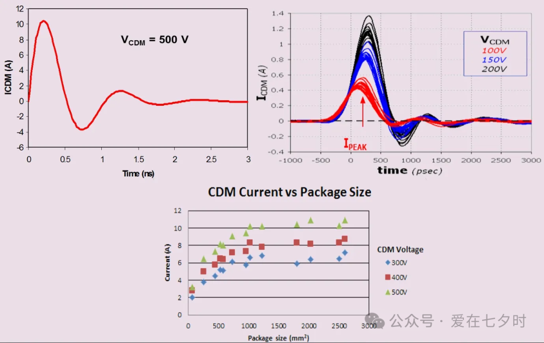 静电放电即ESD(Electro-Staticdischarge),是指具有不同静电电位的物体互相靠近或直接接触引起的电荷转移。ESD是20世纪中期以来形成的以研究静电的产生、危害及静电防护等的学科。因此,国际上习惯将用于静电防护的器材统称为ESD。ESD产生的原因多种多样,对集成电路放电的方式也有所不同。为了保证集成电路产品的良率,提高可靠性,需要对集成电路ESD防护能力进行测试。一般可分为两类:样品研究型测试和产品通过型测试。 (1)样品研究型测试:在芯片的研发阶段,与ESD防护研究最为相关的是防护器件的功能测试。此阶段的测试广泛采用传输线脉冲技术(TLP)。通过 TLP测试,可以获得防护器件的关键性能参数,便于在生产制造过程中调整相关的设计,从根本上提高产品的ESD防护能力,保证良率。 (2)在产品通过型测试中,为了更好地量化不同情形下的ESD冲击,一般分为五种不同的模型。包括工业界作为产品片上ESD等级衡量标准的:HBM、CDM、MM模型和针对板级和系统级ESD防护的IEC(International electrotechnical commission)模型和HMM人体金属模型(Human metal model)。一、 HBM模型:人体因摩擦等原因带上一定的静电荷之后,与集成电路的某些引脚接触且集成电路的另一部分引脚恰巧接触到地时,人体上的静电荷就会流经集成电路进入大地。人体能贮存一定的电荷,所以人体明显地存在电容。人体也有电阻,这电阻依赖于人体肌肉的弹性、水份、接触电阻等因素。大部分研究人员认为电容器串一电阻是较为合理的电气模型,。早在1962年,美国国家矿务局测得22人次人体电容范围为95~398PF,平均电容值为240,100次试验测得手与手之间的平均电阻为4000Ω。这些数据为建立了人体模型起了一个好的开端,做过一些修改之后,用在电子工业中建立早期的模拟电路。Kirk等人测得人体电容值的范围为132-190PF。人体电阻值为87-190Ω。为了求得一致,美国海军1980年提出了一个电容值为100PF,电阻为1.5kΩ的所谓“标准人体模型”。Human-Body Model and Electrostatic Discharge (ESD) Tests - In Compliance Magazine。这一标准得到广泛采用,但在后来也遇到一些问题。HBM模型放电时间长,峰值电流小,大约在几百纳秒的时间里产生数安培的瞬间放电电流。如果没有适当的防护措施,这个瞬间的大电流足以对集成电路芯片造成损坏。 添加图片注释,不超过 140 字(可选) 典型的HBM波形有2~10纳秒的上升时间、0.67安培/千伏特的电流,及200纳秒脉冲宽度的双重指数信号衰减波形。在ESD的仿真中,添加这样一个pulse电压。在HBM的情况下,这个pulse的peak电压取Vtrigger,上升沿和下降沿是1ns,持续时间400ns。而针对CDM,加入一个高达15V的pulse,上升沿和下降沿都是200ps,持续5ns。 添加图片注释,不超过 140 字(可选) 在实际使用过程中,芯片的每只引脚都有可能遭受ESD袭击,并且所带的静电电荷有可能是正电荷也有可能是负电荷,因此在芯片出厂之前需要对每只引脚进行相应的正向静电应力和负向静电应力测试。对于HBM,根据芯片引脚的分类,主要是: (1)I/O引脚对电源和地引脚的应力测试:对于每一个I/O引脚而言,其相对于正电源或者负电源都可能存在正向静电应力和负向静电应力,因此I/O引脚有四种测试模式,PS模式(positive to VSS),NS模式(negative to VSS),PD模式(Positive to VDD),ND模式(negative to VDD)。当某一引脚对电源进行应力测试时,其他引脚需处于悬浮状态。 添加图片注释,不超过 140 字(可选) (2)I/O引脚到I/O引脚应力测试:不同I/O引脚之间也存在正、负两种应力情况,在实际静电放电过程中,通常是其中某一个I/O引脚遭受ESD应力而另一个或多个I/O引脚接地形成ESD路径。为了节约时间并更全面地模拟现实情况,通常对某一I/O引脚进行I/0引脚到I/O引脚的应力测试时,要将其他所有I/O引脚全部接地。电源VDD引脚和VSS引脚处于悬空状态。 添加图片注释,不超过 140 字(可选) (3)VDD引脚到VSS引脚应力测试:电源引脚之间也存在正、负两种应力情况,在进行正电源VDD引脚到负电源VSS引脚的应力测试时,所有I/O引脚需处于悬浮状态。 添加图片注释,不超过 140 字(可选) HBM试验步骤:(1)准备好被测样品的规格书,内容要包括其PIN脚的定义图。一般分类有四种:电源,地,输入和输出四大类; (2)准备一个连接器,此连接器焊在PCB上,并从PCB上引出PIN用于插在测试仪器的PIN槽;(3)准备好需要的样品数;(4)准备好需要测试模块参数性能的仪器; 添加图片注释,不超过 140 字(可选) HBM静电放电故障判断:静电敏感器件(ESDS)经ESD测试后,要判断是否已被破坏,以便决定是否要再进一步测试下去,但是如何判定该静电器件已被ESD所损坏了呢?常见的有下述三种方法: (1)绝对漏电流:当器件被ESD测试后,其I/O脚的漏电电流超过1uA(或10uA)。漏电电流会随所加的偏压大小增加而增加,在测漏电电流时所加的偏压有人用5.5V(VDD×1.1),也有人用7V(VDD×1.4) (2)相对I-V漂移:当器件被ESD测试后,自I/O脚看进入器件内部的I-V特性曲线漂移量在30%(20%或40%) (3)功能观测法:先把正常且符合规格值器件的每一只脚依测试组合打上某一电压准位的ESD测试电压,再拿去ATE复测是否符合原来的规格。 知名的IEC61000-4-2有时也称为「人体放电模型」,但该模型是针对一个系统中不同操作条件下发生的各种ESD事件,故仅适用于该系统而已。IEC 61000-4-2和JS-001的波形和严谨度无法互比。在组件组装、包装和运输可能对单个组件造成 ESD 损坏的半导体制造环境中,