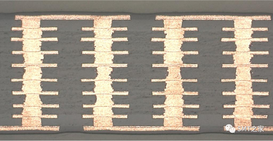 覆晶封装Flip Chip Package于无铅化之蜕变 覆晶载板的制造 1.覆晶载板FC Carrier是一种HDI增层(Build up)式多层板。其中Core板为高Tg(220℃)刚性强与超薄铜皮(5μm)的特殊板材。而增层者则一律为ABF/GX-13的干膜式板材,增层的各种铜导体则为SAP半加成法线路,目前可量产的线宽线距为15μm/15μm。 SMT-HOME 1.1.2 半加成SAP法(Semi-Additive Process)是利用大运味之素(Ajinomotor)之白色干膜式薄卷材 为增层的介质(Dielectrics)材料,再利用化学钯与化学铜做为电镀铜增厚的基地,并按现行减成法制做细线与重复互连工程而成为覆晶载板。 ![]() 1.1.3 半加成法是利用正统PTH流程之化学钯与化学铜做为导电基地,而进一步在光阻定义下以电镀铜增厚完成二次铜的线路,去光阻与差别性蚀刻(Differential Etching)后即可取得互连的细线与盲孔,但咬不掉的贵金属残钯层却成为绝缘不良的隐忧。 ![]() 1.1.4 目前最常用白色的ABF/GX-13中含SiO2球形填充料Fillers已较多,约30% w/w,厚度 40μm,宽度502㎜,每卷总长100m单价达NT四万元,排版510*600 mm者每片NT 250元。压合熟化后Tg达170℃。经Desmear将盲孔壁与全增面先行粗化,之后浸镀上化学钯与铜 的金属化后,即可代替传统铜箔用途而称为SAP法,但同时也留下残钯的隐忧。 ![]() 1.1.5 覆晶载板经绿漆完工后还 需进行表面处理的可焊工程,也就是需在载板正面中央区绿漆开口(SRO)的凸块(Bump)铜 质承垫上,以及正面外围被动原件的贴焊与反面的植球垫上同时加镀化学锡。之后在凸块垫上加印63/37的Low Alpha Eutectic锡膏并回焊与压平成为 FC的Presolder,其他两化锡区 则另外加印SAC 305的无铅锡膏与回焊,也都成为预焊料。 ![]() ![]() 1.2 覆晶载板的封装1.2.1 正统FC封装是以C4方式(Controlled Collapse Chip Connection)作为晶片UBM与载板上已有中铅预銲料( Presolder,Entectic 63/37 )之承垫间,另以高铅凸块Bump ( 95% pb + 5% Sn )为互连体进行三者的熔融互连(Inteconnection)。 ![]() 1.2.2 正统C4高铅Bump的好处很多: (1)熔点高达320℃不受后段高温制程影响 (2)非常柔软,可降低外力的冲击 (3)采助焊膏先黏着于预銲料上,后于230℃氮气回焊中不致发生空洞Void。但在环保压力也尽量在找无铅替代品,不过都存在着极多问题。 ![]() ![]() 1.2.3 高铅式凸块封装的业者们为了RoHS的 禁铅与企业形象起见,都积极寻找高铅(95/5 或90/10)以外的替代品。已量产者多采63/37 Eutectic式中铅凸块为过渡性材料。 此种中铅銲料之柔软度尚好,但却因组成与 预銲料完全相同,致使助焊膏裂解的气体将大幅渗入凸块而形成空洞,且后续Bump间也容易出现熔锡短路的麻烦。 ![]() ![]() ![]() 1.2.4 无铅凸块封装的试行量产 某些著名品牌的日商为了形象起见,乃率先采用无铅预銲料及无铅凸块进行FC封 装。须知SAC 305不但m.p.比63/37者高了34℃,而且弹性模量也多出25%(SAC 305为51GPa,63/37为40.2GPa)。由于305柔软性欠佳以及载板很薄刚性不足下,经覆晶、植球、以及PCBA等多次回焊强热中,难免造成角Bump或角Ball从僵硬銲料之IMC处被拉裂。此种必然性的失效或脆弱对可靠度将造成隐忧。 ![]() ![]() 2.电路板整体性进展 逐层互连(ELIC)式HDI多层板类的兴起 现行镭射烧孔(Ablation) 每秒钟可达1,000孔,在成本大幅下降又加上镀铜填孔技术快速进步下,商品板500x600 mm 的双面百万盲孔者(载板有时可 达单面百万盲孔),均可轻松解 决。使得容易设计的ELIC式增层板也大为流行。 ![]() ![]() 2.1.2 由于ELIC是经过多次压合,多次成像,多次填铜;且又是高精密度大排版的量产工 程,因而不但设备昂贵、流程漫长、工序严谨、导致变量极多。其制程管理与失效改善均亟需学理深入及经验丰富的高手进行解困,盲孔脱垫即为一例。 ![]() 2.1.3 由于ELIC是多次重覆增层之精密制程,一旦稍有闪失,出货到客户端多次锡膏回焊中,难免会出现盲孔铜壁与底铜垫之间的界面分离。这种失效只要超过200 DPPM(以单片货板为统计单位)将立即成为严重客诉的案例。 ![]() 2.2 HDI商品板的困难化 2.2.1 以水果公司为代表的第四代手机板(HDI式10层之薄小板,厚度1㎜),其SMT组 装不但引入POP技术(下图左上)而且被动元件更已小到了01005(10㏕长,5㏕宽,见下图右上),对PCB与PCBA均造成了另一次严酷的挑战。因为所贴焊的电容器太小,锡膏回焊中很容易发生立碑(Tomb Stoning)现象。 ![]() 2.2.2 再从01005立碑处銲点之观察,可见到右封头之ENIG承垫几乎完全未出现Ni3Sn4小草般的IMC,証明焊接之初即已被左端较大的沾锡力量(Wetting Force)所拉起来了。 ![]() ![]() 2.2.3 立碑的原因约可分为:两端头所受热量不均,绿漆过厚形成翘翘板效应,板材太软刚性不足,锡膏面上贴件时一端若踩歪,其回焊中将容易翘起而立碑。 ![]() 2.3 高可靠度级板类的兴起 2.3.1 板体厚大布局面单的汽车板,但却被要求Class Ш ( IPC-6012C/2010.4 )高可靠 度High Reliability的品级,当然其单价之高出也远超过小孔细线的商品板类。其中 AirBag,ABS等与安全有关的多层板类,其进入门槛更是高不可攀。 ![]() ![]() 注意其等互连度毫无钉头Nail-Head与1mil以内渗铜wickin的高规格品质 ![]() 2.3.2例如布局简单叠构容易线路宽松的四层板,其内层两个铜面的厚度居然到达400um (16mil or 12oz)之罕见实例,成为PCB制程的一大挑战。 ![]() ![]() ![]() ![]() 2.3.3 ClassШ的高级板,若与一般ClassⅡ工业级等数量庞大单价不高的资通板类相比较时,其质量之落差简直就是霄壤云泥。后者只要堪用根本谈不到可靠度。 ![]() 至于