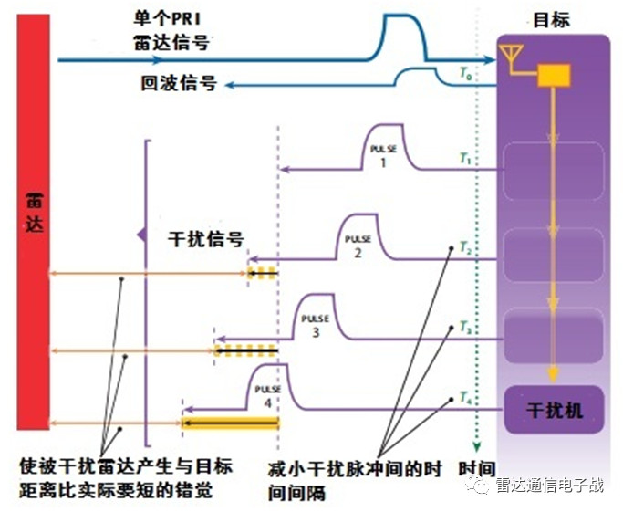 压制式干扰压制式干扰即发射信号(当被雷达接收时),降低雷达处理回波信号的能力。一般而言,压制式干扰采用噪声调制,然而在某些情况下也会采用其他调制样式压制雷达的特殊工作模式。 如图所示,压制式干扰使雷达显示屏充满杂波,无法看清回波信号。图中是一个平面位置显示器(PPI)屏幕,显示屏或其他雷达输出设备出现的类似情况是由压制干扰引起的。 ![]() 压制式干扰产生背景杂波,使雷达很难或无法从接收信号中提取所需信息 阻塞式干扰 如图所示,因为受干扰雷达仅在带宽内接收能量,不接收门限以外的脉冲信号,所以大部分干扰功率是无效的。干扰效能定义为目标雷达实际接收的干扰功率占干扰发射功率的比例。 ![]() 图 阻塞式干扰可以在宽频段内连续辐射信号功率。这样效率比较低,因为受扰雷达只能看到雷达带宽内的干扰,只在回波信号到达时才会接收信号 瞄准式干扰 ![]() 图 瞄准式干扰发射覆盖受扰雷达工作频率的窄带信号 ![]() 图 瞄准式干扰时,干扰带宽仅略大于受扰雷达信号的工作带宽,可以获得最佳的干扰效能。然后,由于制造工艺限制,带宽通常要宽的多,在3-20MHz之间 扫频式干扰 ![]() 图 扫频式干扰仅覆盖了受扰雷达工作频段的一部分,不过扫频式干扰可以扫描整个频段 图 干扰多部不同工作频段的雷达时,需要复杂的射频切换,多点瞄准式干扰是最有效的干扰技术 距离波门拖引 如图所示,这是回波信号脉冲的时间特征。距离波门拖引(RGPO)是通过增大功率和拖引极小的脉冲间隔转发敌雷达脉冲,这样会增加脉冲延迟。延迟时间呈抛物线或指数形式增加。 ![]() 距离波门拖引干扰通过增大功率和发射数量较多的延迟脉冲串,模拟目标远离雷达的运动将延迟回波信号脉冲到达敌雷达显示器的时间,使目标看起来好像偏离了雷达。如图所示,延迟脉冲进入雷达接收机后波门,使雷达距离跟踪电路得出的目标距离比实际大得多。 ![]() 距离波门拖引干扰发射的延迟放大的回波信号脉冲,增大雷达后波门功率,使雷达向外推算目标距离,远离实际的目标 干扰脉冲的延迟增加到最大值后迅速恢复到零,然后不断重复这样的过程。这使雷达无法对目标进行距离跟踪。如图所示,这是这种过程的另一种形式(称为距离波门欺骗)。 ![]() 干扰非相干雷达时,可以使用转发器自动进行距离波门欺骗。每接收到一个雷达脉冲,转发器向雷达发射一个延迟的射频脉冲 需要注意的是,如果雷达切换到回波信号脉冲前沿跟踪模式,距离跟踪器将忽略延迟的干扰脉冲,继续跟踪真实的回波信号脉冲,这时候需要采取其他干扰技术。 距离波门牵引 这是另一种方法,主要针对前沿跟踪,使用脉冲重复频率(PRF)跟踪系统预测后续每一个脉冲的到达时间,在回波信号脉冲到达之前发射一个功率更大的脉冲,如图所示。 ![]() 距离波门牵引干扰发射大功率脉冲,首先要与回波脉冲一致,接着生成数量越来越多的脉冲串,模拟目标向雷达方向运动 这项技术称为距离波门牵引(RGPI)或者到达距离波门拖引。干扰信号引导时间从零开始呈抛物线或指数增长,使目标看起来正向雷达运动。雷达距离跟踪器得出的距离要比实际距离短。这种雷达跟踪器前波门电路图如图所示。 ![]() 距离波门牵引干扰发射强干扰脉冲,会增大雷达前波门的功率,使雷达在真实回波信号脉冲进入之前开始距离估算 距离波门牵引需要计算未来脉冲的到达时间。雷达脉冲重复间隔固定或参差时可以计算,但雷达脉冲重复间隔随机抖动时无法计算。 速度波门拖引 如图所示,这是连续波多普勒雷达的接收功率相对频率的变化关系。考虑到地形特征引起的相对速度,所以有多个频率响应。 ![]() 多普勒雷达有与地形和目标飞机相对视向速度一致的多普勒频率分量。速度波门被置于跟踪目标周围 速度波门被置于跟踪目标周围,一旦大功率信号进入速度波门,将激发频率跟踪功能,如果它远离真正的回波信号频率,雷达得到的目标速度与真实速度不同,可以破坏雷达的速度跟踪。这项技术可用来干扰脉冲多普勒雷达。 逆增益干扰 非单脉冲雷达通过回波信号脉冲幅度图形特征(相对于时间),确定目标的方位和高度。例如,圆锥扫描天线可以探测回波信号能量随时间的变化,如图所示。 ![]() 图 雷达天线没有直接指向目标时,回波信号脉冲幅度较小,这时逆增益干扰会发射幅度较大的脉冲 回波信号功率呈正弦变化,天线波束距目标最近时回波信号功率最大,当天线波束距目标最远时回波信号功率最小。可以操纵天线将目标置于圆锥扫描中心,并向最大脉冲幅度方向旋转。 如果在正弦波低点发射功率增大的突发同步脉冲,雷达接收机将收到组合脉冲幅度图形,如图中虚线所示。雷达必须有一个带宽相对较窄的跟踪滤波器,才能得到正确的制导信号,否则雷达跟踪电路无法检出突发的幅度变化。 因此,雷达会认为正弦波的相位出现了颠倒。蓝色虚线叠加在图形底线,就是跟踪系统掌握的接收功率图形。将扫描中心远离目标而不是朝向目标,可以破坏雷达的角度跟踪。 这项技术可以用来干扰多种天线扫描类型的雷达,但无法干扰单脉冲跟踪雷达。 自动增益干扰 自动增益控制(AGC)干扰即发射大功率、窄带、低占空比的干扰脉冲。雷达必须靠自动增益控制来处理所需的高动态范围。未来,自动增益控制必须具备快速攻击慢衰减的特性