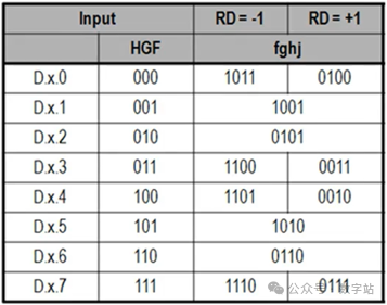 018B10B解决的问题8B10B编码是1983年IBM公司提出的传输编码标准,通常用于高速收发器中,常见的JESD204B、SATA等接口协议,使用查表就可以实现编码和解码。在这些高速收发器的接收端需要通过CDR技术去恢复时钟与数据的相位关系,在这个过程中需要不断的检测数据边沿和数据中心,从而调整时钟和数据的相位,因此需要保证接收的数据需要不断的变化,从而给CDR提供足够多的待检测数据边沿。 另外高速接口电路一般采用交流耦合方式进行连接,在交流耦合电路中的信号线会接电容(隔直通交),如果传输的数据在一段时间内全是1或全是0,那么这段时间传输的信号可以等效成直流信号,会产生直流偏移,在通过电容时,有可能解码错误。 因此通过8B10B编码,保证编码后的数据在一定时间内0的个数与1的个数保持相等。 028B10B编码规则 8B10B就是把8位数据编码成10位数据,8位共有256种状态,而10位数据有1024种状态,可以从1024种状态中选取256种0和1个数相等的数据作为编码结果,在从剩下的数据中选取12个作为控制字符,即常见的K码。 如下图所示,将输入的8位数据分为高3位和低5位,分别进行3B4B、5B6B编码,结果为10位数据。 ![]() 图1 8B10B编码原理 通常把编码前的低5位数据EDCBA的十进制数值记为x,把编码前的高3位数据HGF的十进制数值记为y,原始8位数据可以表示为D.x.y。 比如待编码数据为110_00011,高3位数据的十进制为6,低5位的十进制数据为3,则D.3.6就表示110_00011。 常见的控制字符K.28.5的也是采用上述方式,控制字符的编码结果是固定的,不会与数据的编码结果冲突。 低5位数据总共有32种状态,对应的5B6B编码规则如下表所示。 图2 5B6B编码原理 下面是3B4B编码的表格,原理与5B6B编码一致。 ![]() 图3 3B4B编码原理 可能第一次看下表会有疑问,为什么D.00的编码结果有两种?RD又是什么东西? 5位数据总共有32种状态,编码结果有6位数据,0和1数量相等的只有000_111、001_011…、110_001、111_000等20种状态。其中000_111和111_000存在三个连续相同的状态,并没有被使用。导致编码后0和1数据相等的结果就只有18种状态,并不能满足输入5位数据的32种数据状态,3B4B编码也有同样的问题。 此时设计编码的人提出,一次编码如果不能保证编码结果0和1个数相等,那么可以让连续两次编码结果的0和1相等,也能满足要求。 极性偏差(running disparity,RD)用来记录上一次编码结果中0和1个数的多少。RD=-1表示编码结果1多于0,RD=1表示编码结果0多于1。 如果编码结果的1和0个数相等,称为平衡编码,此时RD的数值保持不变。如果编码结果1和0个数不等,称为非平衡编码,此时RD的数值翻转,下次编码采用RD对应数值的编码作为编码结果。 将上次8B10B编码结果的RD数值用作本次5B6B编码的起始RD,而3B4B编码的起始RD等于5B6B编码结果的RD,3B4B编码结果的RD作为本次8B10B编码的RD。 对应的编码状态跳转如下图所示。 图4 编码状态 通过这种方式才能保证一次编码结果要么0和1个数相等,要么相差两个。关于这方面的讲述,网上绝大多数文章都是错误的,认为上次8B10B编码结果的RD会作为下次5B6B和3B4B编码的起始RD,造成3B4B编码错误。 上述讲解的是数据编码过程,因为8B10B编码大多用于异步串行通信,接收方需要识别数据的帧头、帧尾这些控制信息,从而完成数据的对齐、同步等等。 因此8B10B编码有12个控制字符,通常称为K码,这些控制字符的编码结果是唯一的,不会与数据编码的结果重复。下表就是12个控制字符的编码。 ![]() 图5 K码的编码规则 因为K码的编码结果是唯一的,因此接收端检测K码的方式很简单,通过一组移位寄存器,将输入数据依次移入,当移位寄存器的数值与K码的编码结果相同时,就认为检测到对应K码了,从而实现对应功能,包括逗号检测、时钟纠正、起始位、停止位等等。 038B10B编码练习 8B10B相关的理论讲解就到此结束了,以两个示例测试是否真的掌握该编码,请问D.8.3的8B10B编码结果是多少? 由于起始RD并没有明确指出,可能为1或者-1,所以会存在两种编码结果。 首先RD=-1时,根据图2得D.8的5B6B编码结果为111001,5B6B编码完成后,RD翻转变为1。将RD=1作为D.x.3的3B4B编码起始RD,根据图3查表得编码结果为0011,再次将RD翻转作为本次8B10B编码结果的RD。 因此起始RD=-1的编码结果为111001_0011,先输出高位数据。 当起始RD=1时,根据图2得D.8的5B6B编码结果为000110,RD翻转作为3B4B起始RD,得D.x.3的3B4B编码结果为1100,因此8B10编码及热锅为000110_1100。 怎么验证上述计算是否正确呢? Xilinx的UG476手册的附录有所有8B10B编码数据的结果,如下图所示,起始RD=-1时,D.8.3编码结果为111001_0011,起始RD=1时,D.8.3编码结果为000110_1100,与上述计算结果保持一致,证明计算方法没有问题。 图6 D.8.3的编码结果 第二个问题,当前RD=1,则K.28.5、D.2.6、D.23.4的编码结果依次是多少,且最终的RD是多少? 首先RD=1时,通过图5查得k.28.5编码结果为110000_0101,然后RD保持不变,因为K28.5的5B6B和3B4B都是不平衡编码,因此RD翻转两次的结果就是不变。 因此D.2.6的起始RD=1,首先D.2的5B6B编码结果为010010,RD翻转变为-1。D.x.6的3B4B编码结果为0110,由于D.x.6是平衡编码,因此RD保持不变。 故D.2.6的编码结果为010010_0110,RD最终为-1。 当RD=-1时,D.23.4的5B6B编码结果为111010,然后RD翻转为1。之后D.x.4的编码结果为0010,RD的极性再次翻转为-1。 所以K.28.5、D.2.6、D.23.4的编码结果依次是110000_0101、010010_0110、111010_0010,RD的最终取值为-1。D.2.6
