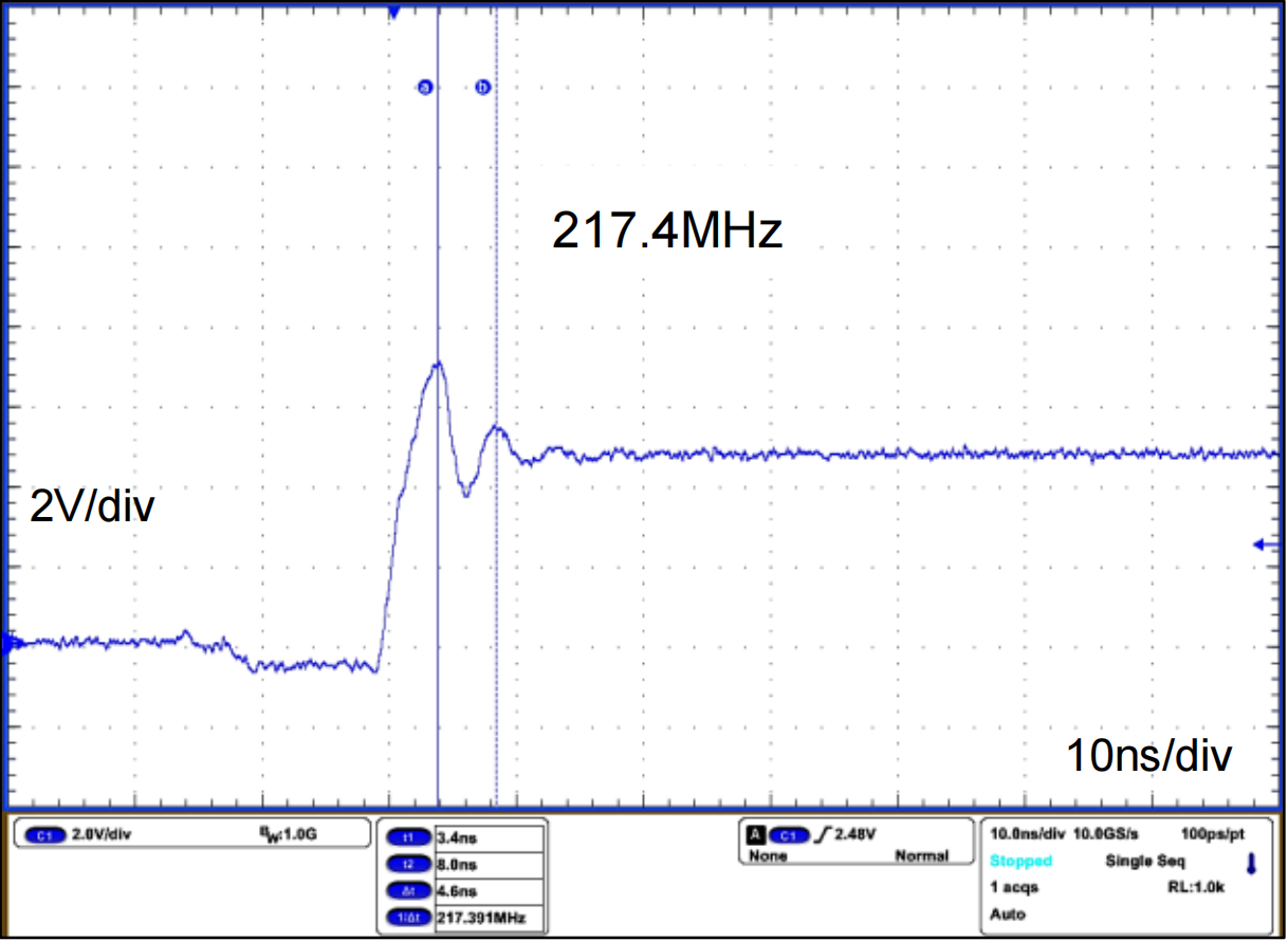 €1.RC缓冲电路如图20-1是一个典型的降压DC-DC的结构简图: 图20-1: 降压开关转换器电路 图20-2:考虑寄生参数的电路 但实际上如图20-2所示会存在很多寄生电感LP和寄生电容CP,高边开关在导通和关断时,由于寄生电感蓄积的能量,在输入环路里会产生共振。因为寄生参数的值由于非常小,所以共振频率可以达到数百MHz以上,如图20-3的开关振铃,会导致EMI特性劣化。 图20-3:SW开关节点振铃波形 RC缓冲电路是用来去除高次谐波噪声的一种有效方法,如图20-4所示在开关节点只需追加RC网络就可以实现降低高次谐波噪声。 图20-4:RC缓冲电路 图20-5展示了缓冲电路的动作过程:当高边开关导通时,寄生电感蓄积的能量通过缓冲电容CSNB ,作为静电能量存储在电容里。开关节点电位会上升到输入电压VIN,当充电到VIN时,电容储存了1/ 2×CSNB×VIN×VIN能量。这时候缓冲电阻RSNB里会产生与充电能量相同的1/ 2×CSNB×VIN×VIN阻抗损耗。当低边开关导通时,开关节点会降低到GND电位,所以缓冲电容CSNB蓄积的能量会通过缓冲电阻(阻尼电阻)放电。这时候缓冲电阻RSNB会消耗1/ 2×CSNB×VIN×VIN能量。作为这个公式的补充说明,充电后电容电荷Q由CSNB×VIN求得,电源供电功率为VIN×Q=CSNB×VIN×VIN。电容蓄积能量和释放能量在充放电周期CR 常数设定足够长的话,只由电容容量和电压决定。充电时电源有一半能量由于电阻变成了焦耳热,剩下的一半作为静电容量储存在电容里。放电时蓄积的一半静电能量由于电阻变成了热能。即使电阻值变化,只会充放电所需时间发生变化,但是这个比例是一定的。 开关一个周期合计会由电阻产生CSNB×VIN×VIN损耗,仅开启关断的次数就会产生损耗,所以产生损耗由CSNB×VIN×VIN×fsw求得。即使无负载,但是只要有开关动作,缓冲电路就会产生损耗,所以这就成了效率降低的要因。 图20-5:缓冲电路的动作过程 €2.计算RC的值 介绍了消除振铃的缓冲电路RC值由下面两个公式求得: LP和CP2是寄生参数,有手册不公开该信息,或值太小难以进行参数计算。下述实例按照一边在实机上测量实际的开关波形,一边计算相关参数的方法进行说明。 €3.RC值计算步骤 #1. 使用示波器测得振铃频率fr。 #2. 在开关节点和GND之间接入电容CP0,求得振铃频率变为1/2时的电容值。 #3. 电容容值CP0的1/3即是寄生容量CP2。 #4. 由寄生容量CP2求得寄生电感LP。 #5. 求得共振的特性阻抗。 #6. 缓冲电阻RSNB设为和特性阻抗Z同等程度的值:RSNB≥Z #7. 缓冲容量CSNB设为寄生容量CP2的1~4倍。 #8. 求得缓冲电阻RSNB的消耗功率。 €4.RC值计算实例 这里一边进行实际测量一边按照RC值计算步骤进行说明。 1. 因为需要使用示波器来测量振铃频率,所以在测试点的开关节点处一定要会使用探头。为了降低探头附加在开关节点处的寄生容量,将探针前端的挂钩尖端除去,使探头直接接触开关节点,因为接地引线会附加电感成分所以去掉。取而代之的是安装接地引线适配器,使接地长度最小化,放大振铃波形,图20-6测得频率为217.4MHz。 图20-6:测定振铃频率 图20-7:追加CP0 2. 如图20-7所示,在开关节点和GND间接入电容CP0,求得振铃频率变为1/2时的电容值。该例将217.4MHz的一半108.7MHz作为目标,实验结果显示当追加680pF电容时,如图20-8所示,振铃频率约为108.7MHz)。 图20-8:将 CPO设为 680pF 时的振铃频率 3. 振铃共振频率由 决定,因此容量值变为4倍的话,频率降为一半。也就是可以推测寄生容量CP2为附加电容CP0的1/3。CP0为680pF时,寄生容量CP2就如下式所示求得: 4. 寄生容量CP2计算得出后,共振频率公式: 变形可以求得寄生电感LP。振铃频率fr为217.4MHZ,寄生容量CP2为227pF,那么 5. 求共振特性阻抗。为了简化计算,不考虑传输线路损耗,由理想的实际数值计算: 6.为了衰减振铃,有必要将缓冲电阻RSNB设为和共振特性阻抗Z同等大小:RSBB≥Z,这里实例选取3.3Ω。 7. 缓冲容量CSNB设定为寄生容量CP2的1~4 倍。计算结果为227pF、454pF、681pF、908pF,实物容值为220pF、470pF、680pF、1000pF。依次改变这些容量,观测振铃波形。结果如图20-9至图20-13所示,可以判断出当容值为680pF时,可以获得无振铃的良好波形。当振铃不消失时,将容量值进一步增加到10倍程度观测波形。但是容量值越大功率损耗就越增加,效率就低下。 图20-9:无缓冲电路 图20-10:RSNB=3.3Ω、CSNB=220pF 图20-11:RSNB=3.3Ω、CSNB=470pF 图20-12:RSNB=3.3Ω、CSNB=680pF 图20-13:RSNB=3.3Ω、CSNB=1000pF 8. 缓冲电阻RSNB的消耗功率由如下公式求得。举例输入电压VIN为5V、开关频fSW为1MHz,因此 缓冲电阻产生了17mW损耗,这个例子损耗虽然小,但是输入电压高的时候损耗也变大,因此不注意电阻的额定功率的话,缓冲电阻就会烧毁。缓冲电阻推荐使用额定功率是消耗功率2倍以上的电阻。 例如输入电压VIN为24V、开关频率fSW为1MHz时: 产生了0.39W消耗功率,因此需要使用额定功率1W,尺寸为6432 (2512 inch)的电阻。这个例子虽然选择了3.3Ω和680pF两个常数,但是这个只对一开始测定的振铃频率有效,还得必须考虑输入电压或负载电流变化时这些参数也会变化的可能性,不管哪种条件都需要将最大程度减弱振铃作为目标值。 |
