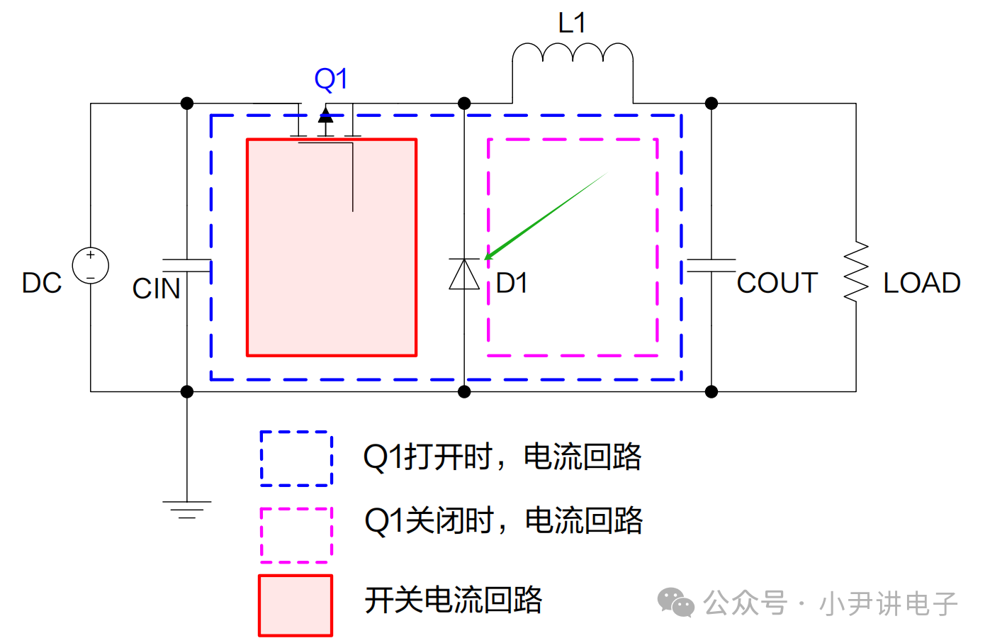 目录o 开关电路的优缺点 o 尖峰电压产生原因 o 改善方法 o 注意事项 1 开关电路优缺点开关电源与LDO不同,开关的电源优点与缺点也非常明显: . 优点 开关电源的主要的特点是效率更高、体积更小、可升压等。 . 缺点 开关电源工作时,会对外产生较大的电磁辐射,可能对周围的器件产生较大影响,导致系统稳定。 2 尖峰电压产生原因为了有效的抑制电路对外产生电磁辐射,应该明确电磁辐射产生的根本原因。电感在功率管不断打开与关闭时,实现电感的充电与放电(能量的储存与释放)。尖峰电压是指突然出现的瞬时高电压值,持续时间较短,波形通常呈现出急剧上升和快速下降。其产生的原因是主要是电流不连续造成,变化的电流会产生尖峰电压。根据以下公式:V=L*di/dt o L是DCDC电路中的寄生电感。 o di/dt是DCDC电路中电流的变化率。 尖峰电压的影响因素主要是由回路中的寄生电感与电流变化率强相关。尖峰电压会产生较大的电磁干扰,可通过抑制尖峰干扰的方式,来降低DCDC电路对外的电磁辐射。具体的实现方式见下面章节: 3 改善方法 3.1 缩短开关电流回路 电流的回流路径见下图,以连续工作状态为例。 o 当功率管Q1打开时,电流回流路径为:CIN->Q1->L1->COUT。 o 当功率管Q1关闭时,电流回流路径为:L1->COUT->D1。 其实,不管Q1的状态,电流都会经过电感L1和输出电容COUT。因此, o 流经L1和输出电容COUT的电流是连续的。 o 开关电流(流经CIN、Q1、D1的电流)是非连续的,会在电感L1上产生毛刺电压,对外会产生电磁辐射。 抑制机理:根据V=L*di/dt可知,在di/dt不变的条件下,可以通过缩短CIN、Q1、D1的电流回路,来减少开关电流回路的寄生参数,从而实现降低系统产生的电磁辐射。 3.2 降低电流变化率 影响尖峰电压的另外一个因素是电流变化率(主要是通过延长电流变化的时间,来降低di/dt的数值)。 抑制机理:通过选择开关速率较慢的二极管,来降低二极管的开关速率(详见下图)。 弊端:这种方式最大的弊端就是增加二极管的损耗和效率,同时也会导致二极管的温度增加,严重影响系统稳定性。 3.3 抑制高频噪声 肖特基二极管本身存在寄生电容,与回路上的寄生电感会产生振铃现象。如果频率分布在高频段(频率超过30MHz),会容易就会被相应仪器捕捉到。 抑制机理:可以通过在肖特基二极管上串接磁珠来降低对外辐射能量,滤除高频信号(详细见下图)。 弊端:肖特基上串联磁珠,会产生较大负向尖峰电压,需要控制输入电压与尖峰电压绝对值之和小于芯片的耐压,确保系统稳定性。 备注:贴片式磁珠材料主要是由磁粉、镍、银浆三大部分组成,其在高频条件下具有相当大的阻抗,可以吸收高频信号(通常30MHz以上为高频)。 3.4 添加RC吸收电路 抑制机理:通过并联RC电路来吸收寄生参数的同时,还是能改变谐振频率,从而达到抑制电磁辐射。 说明:方案三和方案四结合使用效果更佳。 3.5 添加共模电感 天线原理:辐射测试点的频段为30MHz至1000MHz,对应波长为0.3m至10m。发射电磁波的必要条件是天线长度大于波长的1/20。当天线是电磁波半波长的整数倍时,发射的功率最大。 抑制机理:DCDC电源线比较长,有可能对外发射电磁波,类似于天线工作原理。可通过串接共模电感,滤除共模信号,防止辐射超标。 弊端:共模电感具有体积大、成本高、不易加工等缺点,不适合应用于小体积、低成本方案。 4 注意事项 o 优化PCB走线,输入端电容靠近芯片VIN与GND引脚,反馈走线远离开关信号节点,使用 GND 走线包围开关信号节点,同时缩短开关电流回路路径,即将输入端电容正极靠近芯片VI 引脚,肖特基阴极靠近芯片SW引脚,肖特基阳极靠近输入电容负极。 o 在肖特基处串联磁珠和RC吸收电路,磁珠通常选用交流阻抗60-80R,直流阻抗越小损耗越小;RC吸收电路中的电阻阻值在10R左右,电容容量在1nF以内。 |