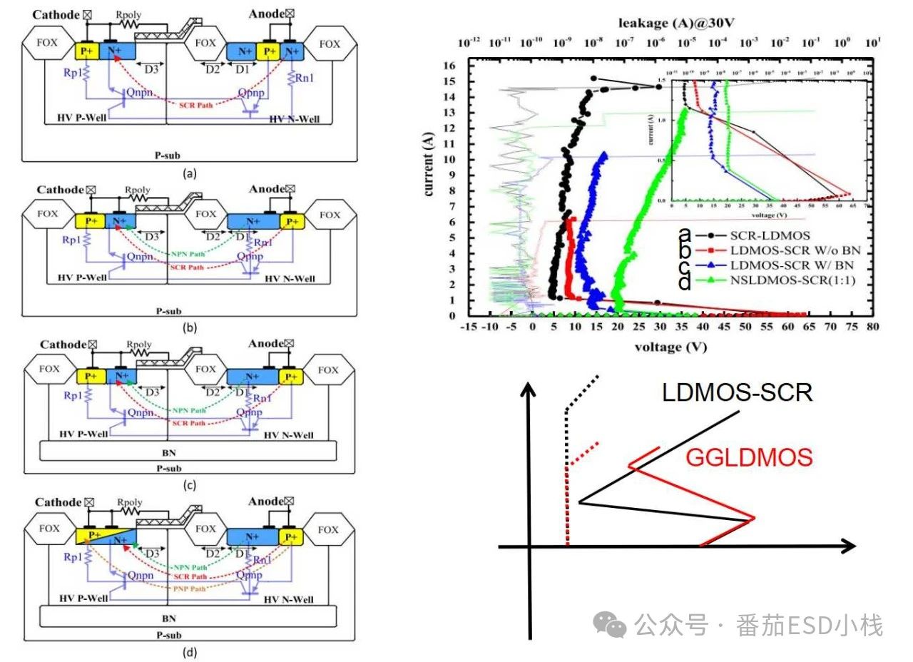 在芯片设计过程中有时需要对特殊端口进行ESD防护设计,例如正负电压输入、大幅信号输入、高压IO、信号完整性等需求。这些特殊端口的ESD防护设计一直都是重难点。这一期对高压端口的ESD防护进行简单概述(这里的高压是指20V~120V)。一.器件设计 高压工艺普遍都是BCD工艺,而且为了提高器件耐压能力,fab会应用到诸如Resurf、场板、Super Junction等技术。 浅谈ESD防护设计—LDMOS的ESD应用(一) 体隔离BCD工艺还需留意器件的隔离设计(SOI工艺在隔离上优势很大)。总的来说HV的ESD防护设计难度更大但是发挥空间也大,更能天马行空。 关于HV ESD Device的设计主要有两种设计思路,一种是设计耐高压的单体器件,这种设计思路不确定性大,结构复杂,设计难度高,但是面积较小,且一致性好。另一种是采取堆叠设计,将低压ESD器件进行堆叠实现对高压端口的防护,这种思路对器件的隔离性能有较高要求,且面积需求大,但是性能稳定,可靠性高。两种思路各有千秋,需要根据场景选择合适的方案。 1.1单体器件 1.1.1 Reverse Diode反偏二极管作为ESD防护器件一般应用于三极管工艺,这类工艺下反偏PN结雪崩击穿后还能保持泄放能力并不会直接被热击穿,而且内部器件的鲁棒性也足够优秀,无需考虑残压残流的影响。所以能直接用反偏二极管作为ESD防护器件。 1.1.2 Bipolar ![]() 图一.Diode与Bipolar的ESD区别。 如图一所示,ESD防护器件中Bipolar与Diode的区别在于雪崩击穿后,二极管只能继续通过阳极持续泄放,直到器件失效,而三极管在雪崩击穿后会产生一个基级电位,从而协助开启整个三极管,三极管开启后因为存在电流放大倍数,整个器件的泄放能力得到增强,表现出Snap-Back特性。所以Bipolar从雪崩击穿转变为热击穿的裕度更大,其泄放能力强于Diode。Bipolar分为Vertical和Horizontal两种结构,每种结构的ESD特性有所区别,且为了提高耐压能力,有些Bipolar中也会应用Resurf技术,这使得Bipolar的技术细节千变万化。这一期只是概述,后续会针对具体技术细节展开讨论。 图二.Vertical Bipolar和Horizontal Bipolar的示意图。1.1.3 GGLDNMOS LDMOS作为耐高压的MOS器件,其也能同NMOS一样将栅极接地进行ESD防护,但是笔者不推荐这种设计方案,具体原因详见:浅谈ESD防护设计—LDMOS的ESD应用(二) 1.1.4 HV Diode SCR针对HV端口的ESD防护,如图三所示,可以将HV Diode改进成为SCR,在HV Diode的HV NweLL中插入P+,在HV PweLL中插入N+,HV NweLL/HV PweLL作为SCR的主结,HV NweLL作为阳极, HV PweLL作为阴极。HV Diode SCR的Holding Voltage 相对于工作电压还是较低,很容易有LU风险,但是过度削弱器件的Snap-Back特性除了会降低器件的Trigger Voltage,还会降低器件鲁棒性,所以只能抬高器件的Holding Current,增大寄生三极管的内阻,以此降低器件误触发的几率。从TLP曲线中看出。两者的雪崩击穿电压一致,雪崩击穿后Diode一直维持正电阻特性,而SCR触发负电阻特性,泄放效率上SCR远高于Diode。因为高压工艺在制备高压阱时受推结深度,推结浓度等影响导致BreakDown Voltage的Min与Max相差较大,且设计不当可能导致雪崩击穿直接演变为热击穿。所以HV Diode SCR的稳定性较差。 ![]() 图三.HV Diode与HV Diode SCR的示意图。 1.1.5 LDMOS_SCR该设计思路是以LDMOS为蓝本改进成为SCR。如图四所示,在NLDOMOS的Drain端插入P+作为SCR的阳极,LDMOS的Source端作为阴极,图中列出了四种不同的版图结构,a).只加P+和N+,b).取消BN埋层,c).增加BN埋层,d).有源区交叉版图,从TLP上看a与d的鲁棒性最佳,a与b的Trigger Voltage最高,a的Snap-Back最深。LDMOS_SCR的泄放效率远高于GGNLDMOS,LDMOS_SCR在漂移区发生雪崩击穿后,寄生的NPN和PNP开始相互耦合,触发Snap-Back的效率更快,从而高效缓解漂移区的热电效应,而GGNLDMOS只能靠寄生NPN泄放ESD,热电效应消散较慢,相比之下LDMOS_SCR能很大程度的避免漂移区对ESD泄放效率的影响,LDMOS_SCR这一技术的特点就是一致性好,LDMOS与LDMOS_SCR的工艺漂移是一致的,虽然不能避免漂移,但是漂移保持一致的话也能减少影响(差模思想)。GGNLDMOS与LDMOS_SCR的TLP如图所示,两者的Breakdown Voltage几近一致,Trigger Voltage相差无几,发生Snap-Back前,两者的曲线基本一致,但是Trigger之后LDMOS_SCR的Snap-Back更深,Holding Voltage/Current更低一些,其泄放能力更强。 ![]() 图四.LDMOS_SCR结构与TLP示意图。HV-WeLL普遍深度较大,浓度较低,而且受制于推结工艺,HV-WeLL并不一定能处处保持浓度均匀,面对ESD时器件会触发不均匀,所以上述四种器件TLP曲线的漏电流比较“曲折”。下面介绍的这种设计思路便能规避这一问题,让器件更加稳定。 1.1.6 Soft TriggerSoft Trigger 是一种ESD器件的设计思路,该设计分为触发器件和泄放器件,前文所述ESD器件都是靠雪崩击穿开启寄生三极管,但是高压器件的雪崩击穿较难掌控,可以通过触发器件协助泄放器件开启寄生三极管,从而实现对泄放器件参数的精确控制。如图五所示为PMOS Soft Trigger的SCR,PMOS优先触发后,将SCR的N-WeLL和P-WeLL中注入电流,SCR不用发生雪崩击穿即可触发寄生NPN和PNP,其TLP如图所示,第一次Snap-Back是PMOS触发造成的,PMOS触发后电流进入SCR的N-WeLL和P-WeLL中,然后SCR发生第二次Snap-Back。与没有PMOS Soft Trigger的SCR相比,PMOS_SCR的Trigger Voltage低于SCR,而且PMOS是低压器件,其击穿电压较稳定,漏电流也不会出现曲折现象。两者的Holding Voltage相差不大,在触发之后PMOS_SCR和SCR的工作机理便相差无二了。 图五.PMOS Trigger SCR结构与TLP示意图。 这一期先讲这么多了,