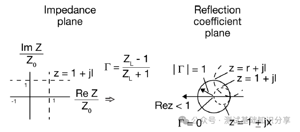 阻抗匹配什么意思?阻抗匹配(impedance matching)指通过调整输入阻抗和输出阻抗来使得电子器件满足一定条件,通常该条件是使得系统传输功率最大或者使得信号反射最小。例如,再无线传输系统中需要匹配射频发射设备和接受天线的阻抗以此来实现传输功率最大化。 阻抗匹配的作用 · 实现最大功率传输:对信号源和负载进行阻抗匹配,可以实现传输功率最大化,提高能量转换性能; · 实现最小反射损耗:匹配阻抗可以减少信号在电路中的反射,提高信号质量和传输效率; · 优化系统性能:阻抗匹配可以确保信号在系统中的稳定传输,避免信号失真和性能下降。阻抗匹配对于获得理想的 VSWR(电压驻波比)非常重要。 · 在PCB测试中,减少高频噪声以及边沿过冲。如果一个信号的边沿非常陡峭,则含有大量的高频成分,将会辐射干扰,另外,也容易产生过冲。串联电阻与信号线的分布电容以及负载输入电容等形成一个RC电路,这样就会降低信号边沿的陡峭程度。还可以减少高频反射以及自激振荡。当信号的频率很高时,则信号的波长就很短,当波长短得跟传输线长度可以比拟时,反射信号叠加在原信号上将会改变原信号的形状。如果传输线的特征阻抗跟负载阻抗不相等(即不匹配)时,在负载端就会产生反射,造成自激振荡。PCB板内走线的低频信号直接连通即可,一般不需要加串行匹配电阻。 当阻抗不匹配时,就要通过阻抗变换使负载阻抗和源阻抗相等,以减小反射。经常是使用史密斯圆图阻抗匹配。反射系数是一个矢量,所以反射系数相同的点会形成一个圆,一系列反射系数形成反射圆图。 反射圆图上的每一个点都有唯一的阻抗特性,这样反射圆图和阻抗圆图重叠形成史密斯圆图。 R值表示等电阻圆, Z值表示等电抗圆有, 交点为Z,该点半径为反射系数模值,夹角为反射系数相位。 请参考右下方的史密斯圆图,上面左边的点表示短路点,阻抗为0,反射系数是1,发生全反射,反射角为180度。中间点为匹配点,阻抗为特性阻抗,反射系数为0。右边点位开路点,阻抗无穷大,反射系数为1,同样也发生全反射,反射角为0度。上面是电感区,下面是电容区,然后上面还有等电阻圆,等点抗圆,等电导圆等等。 注意: 阻抗用直坐标系的话,需要看到无穷大的阻抗横轴和虚部纵轴,在仪表里显示是不现实的,所以用圆图。 圆图的周期为传输线信号波长/2。圆图旋转一圈代表传输线传输电长度为l/2,半圈为l/4。 史密斯圆图 The Smith Chart 贝尔实验室工程师菲利普·史密斯 (Phillip Smith) 设计了一种图解法,用于求解微波理论中常见的重复方程式。 例如反射系数方程式 Γ = (Z – 1)/(Z + 1)。由于该方程式中的所有值都是复数,因此使用史密斯图解法可以简化求解该表达式的繁琐过程。 该图本质上是两个平面——Z(或阻抗)平面和 Γ(或反射系数)平面——之间的映射。我们都熟悉阻抗平面——一个具有实轴和虚轴的直角坐标平面。任何阻抗都可以绘制在这个平面上。在本讨论中,我们将阻抗平面归一化为特性阻抗。 让我们在这个归一化平面中选取几个值,看看它们如何映射到 Γ 平面。令 z = 1。在 50 欧姆系统中,这意味着 Z = 50 欧姆。对于这个值,|Γ| = 0,即Γ平面的中心。 现在我们令z为纯虚数(即z = jx,其中x可以从负无穷到正无穷变化)。由于Γ = (jx – 1)/(jx + 1),|Γ| = 1,其相位角在0到360度之间变化。这在Γ平面上描绘出一个圆(图29)。对于正电抗,即jx为正,阻抗映射到上半圆。对于负电抗,阻抗映射到下半圆。上半圆区域为感性区域,下半圆区域为容性区域。 现在让我们看一些其他的阻抗值。一条通过实轴上z = 1点的恒阻线,在Γ平面上映射成一个圆。 上半圆表示阻抗为1 + jx,即感性区域; 下半圆表示阻抗为1 - jx,即容性区域。 恒电抗线 r + j1 也以圆的形式映射到 Γ 平面上。当我们接近阻抗平面的虚轴时,Γ 接近单位半径圆。当我们穿过虚轴时,Γ 平面上的恒电抗圆会超出单位半径圆。 现在我们回过头来观察 z 的实数,我们可以看到在 z = -1 处,Γ = ∞。当 z 为实数且小于 1 时,我们会向外移动到 Γ 平面上的单位半径圆。当 z 的实部变为负值时,Γ 会继续沿着这个半径无限大的圆移动。单位半径圆外的整个区域表示实部为负的阻抗。稍后我们将在处理晶体管和其他通常具有负实数阻抗的有源器件时用到这个事实。 在阻抗平面上,恒电阻线和恒电抗线相交。它们也会在 Γ 平面上相交。阻抗平面上的点与 Γ 平面上的点之间存在一一对应关系。 通过继续绘制其他恒定电阻和电抗圆,就可以完成史密斯圆图。 史密斯圆图的应用 Applications of the Smith Chart 现在让我们尝试用史密斯圆图举几个例子来说明它的实用性。 1. 阻抗到导纳的转换 将归一化阻抗 1 + j1 转换为导纳可以很容易地完成。让我们首先在史密斯圆图上绘制表示 z 值的点(图)。从这些关系中,我们可以看出,虽然导纳的大小是阻抗大小的倒数,但 Γ 的大小相同,但其相位角改变了 180 度。在史密斯圆图上,Γ 矢量将旋转 180 度。然后可以将该点读作导纳。 我们可以用另一种方法实现阻抗到导纳的转换。与其将 Γ 矢量旋转180度,不如将史密斯圆图旋转180度。我们可以将旋转后的圆图称为导纳图,将原始圆图称为阻抗图。这样,我们就可以直接将任何阻抗转换为导纳,反之亦然。 2. 实部为负的阻抗 现在我们来看看实部为负的阻抗。这又是一个传统的史密斯圆图,由