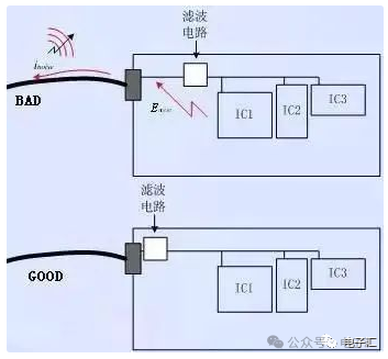 除了元器件的选择和电路设计之外,良好的印制电路板(PCB)设计在电磁兼容性中也是一个非常重要的因素。PCB EMC 设计的关键,是尽可能减小回流面积,让回流路径按照设计的方向流动。最常见返回电流问题来自于参考平面的裂缝、变换参考平面层、以及流经连接器的信号。 跨接电容器或是去耦合电容器可能可以解决一些问题,但是必需要考虑到电容器、过孔、焊盘以及布线的总体阻抗。 文章将从 PCB 的分层策略、布局技巧和布线规则三个方面,介绍 EMC 的 PCB 设计技术。 一、PCB 分层策略 电路板设计中厚度、过孔制程和电路板的层数不是解决问题的关键,优良的分层堆叠是保证电源汇流排的旁路和去耦、使电源层或接地层上的瞬态电压最小并将信号和电源的电磁场屏蔽起来的关键。 从信号走线来看,好的分层策略应该是把所有的信号走线放在一层或若干层,这些层紧挨著电源层或接地层。对於电源,好的分层策略应该是电源层与接地层相邻,且电源层与接地层的距离尽可能小,这就是我们所讲的“分层”策略。下面我们将具体谈谈优良的 PCB 分层策略。 1、布线层的投影平面应该在其回流平面层区域内。布线层如果不在其回流平面层地投影区域内,在布线时将会有信号线在投影区域外,导致“边缘辐射”问题,并且还会导致信号回路面积地增大,导致差模辐射增大。 2、尽量避免布线层相邻的设置。因为相邻布线层上的平行信号走线会导致信号串扰,所以如果无法避免布线层相邻,应该适当拉大两布线层之间的层间距,缩小布线层与其信号回路之间的层间距。|电子汇 3、相邻平面层应避免其投影平面重叠。因为投影重叠时,层与层之间的耦合电容会导致各层之间的噪声互相耦合。 二、多层板设计 时钟频率超过 5MHz,或信号上升时间小于 5ns 时,为了使信号回路面积能够得到很好的控制,一般需要使用多层板设计。在设计多层板时应注意如下几点原则: 1、关键布线层(时钟线、总线、接口信号线、射频线、复位信号线、片选信号线以及各种控制信号线等所在层)应与完整地平面相邻,优选两地平面之间,如图 1 所示。 图 1 关键布线层在两地平面之间 关键信号线一般都是强辐射或极其敏感的信号线,靠近地平面布线能够使其信号回路面积减小,减小其辐射强度或提高抗干扰能力。 2、电源平面应相对于其相邻地平面内缩(建议值 5H~20H)。电源平面相对于其回流地平面内缩可以有效抑制“边缘辐射”问题,如图 2 所示。 图 2 电源平面应相对于其相邻地平面内缩 此外,单板主工作电源平面(使用最广泛的电源平面)应与其地平面紧邻,以有效地减小电源电流的回路面积,如图 3 所示。 图 3 电源平面应与其地平面紧邻 3、单板 TOP、BOTTOM 层是否无≥50MHz 的信号线。如有,最好将高频信号走在两个平面层之间,以抑制其对空间的辐射。 三、单层板和双层板设计 对于单层板和双层板的设计,主要应注意关键信号线和电源线的设计。电源走线附近必须有地线与其紧邻、平行走线,以减小电源电流回路面积。 单层板的关键信号线两侧应该布“Guide Ground Line”,如图 4 所示。双层板的关键信号线地投影平面上应有大面积铺地,或者同单层板地处理办法,设计“Guide Ground Line”,如图 5 所示。关键信号线两侧地“保卫地线”一方面可以减小信号回路面积,另外,还可以防止信号线与其他信号线之间地串扰。 图 4 单层板的关键信号线两侧布“Guide Ground Line” 图 5 双层板的关键信号线地投影平面上大面积铺地 总的来说,PCB 板的分层可以依据下表来设计。 四、PCB 布局技巧 PCB 布局设计时,应充分遵守沿信号流向直线放置的设计原则,尽量避免来回环绕,如图 6 所示。这样可以避免信号直接耦合,影响信号质量。|电子汇 此外,为了防止电路之间、电子元器件之间的互相干扰和耦合,电路的放置和元器件的布局应遵从如下原则: 图 6 电路模块沿信号流向直线放置 1、单板上如果设计了接口“干净地”,则滤波、隔离器件应放置在“干净地”和工作地之间的隔离带上。这样可以避免滤波或隔离器件通过平面层互相耦合,削弱效果。此外,“干净地”上,除了滤波和防护器件之外,不能放置任何其他器件。 2、多种模块电路在同一 PCB 上放置时,数字电路与模拟电路、高速与低速电路应分开布局,以避免数字电路、模拟电路、高速电路以及低速电路之间的互相干扰。另外,当线路板上同时存在高、中、低速电路时,为了避免高频电路噪声通过接口向外辐射,应该遵从图 7 中的布局原则。 图 7 高、中、低速电路布局原则 3、线路板电源输入口的滤波电路应应靠近接口放置,避免已经经过了滤波的线路被再次耦合。 图 8 电源输入口的滤波电路应应靠近接口放置 4、接口电路的滤波、防护以及隔离器件靠近接口放置,如图 9 所示,可以有效的实现防护、滤波和隔离的效果。如果接口处既有滤波又有防护电路,应该遵从先防护后滤波的原则。因为防护电路是用来进行外来过压和过流抑制的,如果将防护电路放置在滤波电路之后,滤波电路会被过压和过流损坏。 此外,由于电路的输入输出走线相互耦合时会削弱滤波、隔离或防护效果,布局时要保证滤波电路(滤波器)、隔离以及防护电路的输入输出线不要相互耦合。 图 9 接口电路的滤波、防护以及隔离器件靠近接口放置 5、敏感电路或器件(如复位电路等)