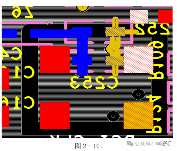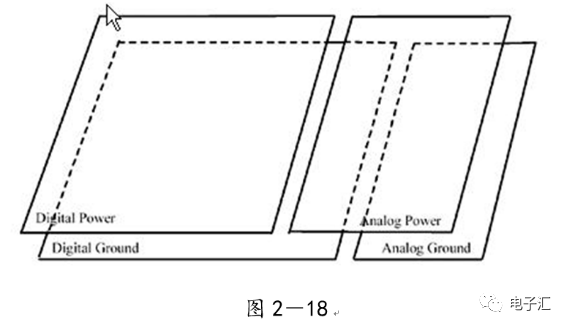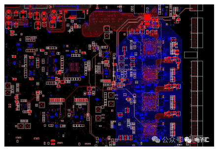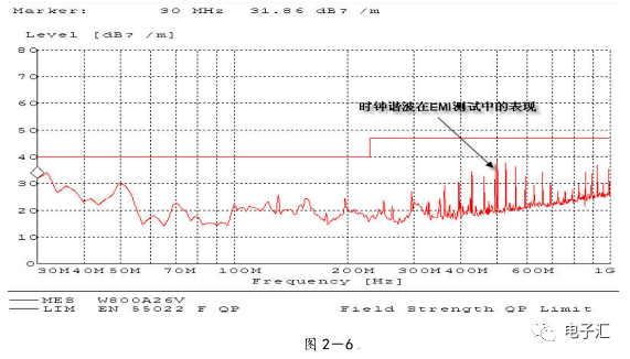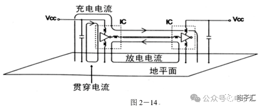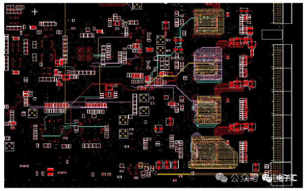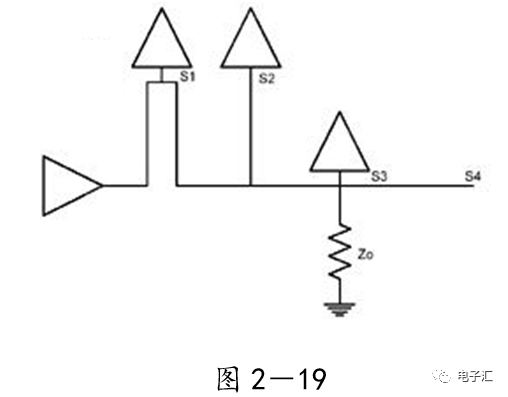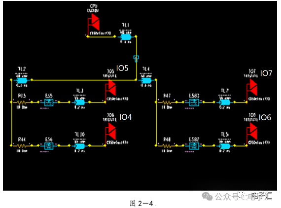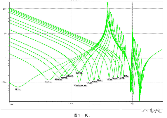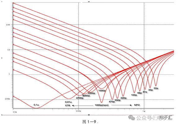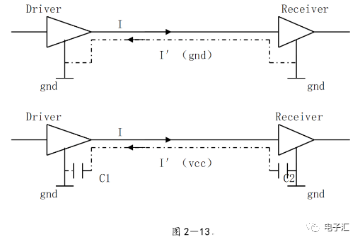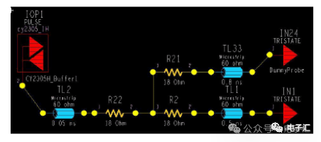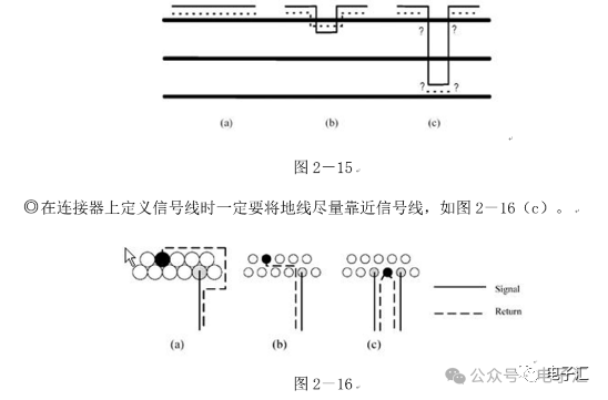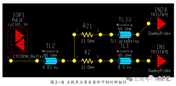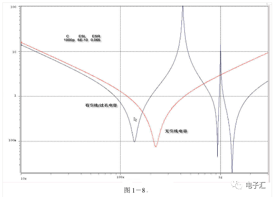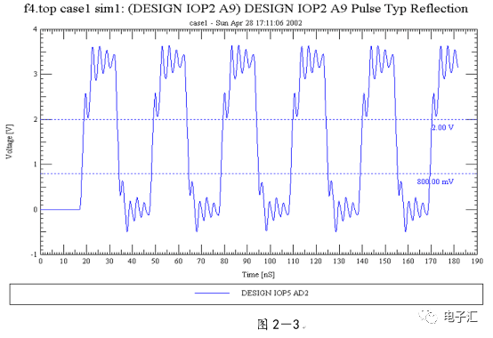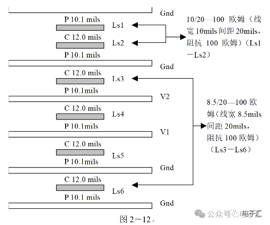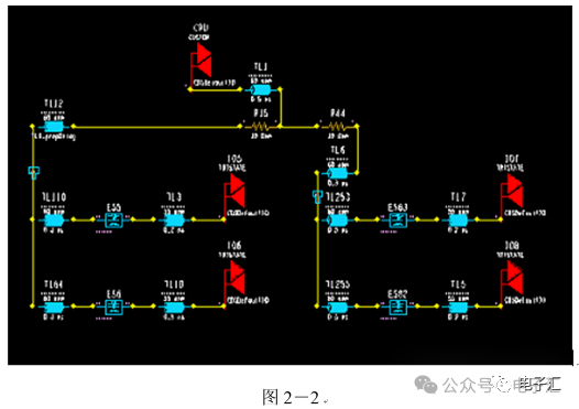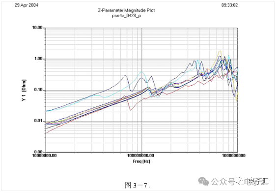 由上表的参数,得到如下的无引线电容的阻抗-频率曲线,如图1-9所示。 考虑引线与过孔的影响,可以推算出电容加上两端引线和过孔的阻抗-频率响应曲线,如图1-10所示: 图1-11反映了有引线/过孔的电容(绿色曲线)和无引线/过孔电容(红色曲线)的阻抗-频率特性的比较,可以看出电容的谐振点有向下漂移的趋势。 4、电源完整性分析软件对电容分布参数的计算: 使用SIWAVE也可以分析出电容的引线及过孔的电感对谐振点的影响,将上面的例子转换成siw文件,加入上述参数的电容(NPO 1000pf),设定PORT,得到如图1-12的阻抗-频率曲线。 从图1-12可以看出:SIWAVE计算阻抗时已经考虑了引线及过孔的影响,1000pf电容的谐振点已经由225MHz向下漂移到150MHz左右。 【仿真电容问题总结】 1) 电容的建模问题是PI仿真非常重要的一步,电容厂家很多,参数不一致,影响PI仿真结果的准确性。一般国内的电容厂家的ESL/ESR值很难提供,可以借助于仪器测量得到参数; 2) 在PCB上完成电容引线时,应该以最小ESL为原则,如:加粗引线,加大过孔等,尽量减小分布电感对谐振点的影响; 3) 可以适当采用电容组合; 4) 对高频段采用小电容要慎重,以防引线/过孔电感造成实际谐振点的向低漂移与产生新的谐振点(反谐振),高频段应该以改进与优化PCB设计为原则。 电源完整性分析与EMI控制 PCB板上存在有两个主要辐射源。第一是来自顶层和底层的传输线。假设这些线相对应的参考平面是理想的,那么它们的差模辐射是可以根据导线电流计算得到的。对于顶层和底层的传输线,尤其是时钟,应避免1/4波长的走线;第二个源就是边缘辐射。电磁场从激发区域经过电源地平面间传播到边缘,在那里产生辐射。平面上存在的任何过孔、不连续阻抗等,都将转变为电源/地噪声和边缘辐射,因此,边缘辐射直接和电源/地噪声和电源完整性相关。一块具有良好信号完整性的PCB很自然的具有较低的电源/地噪声和较低的边缘辐射。 下面结合高速PCB的SI和设计过程和本人在设计中积累的经验,介绍一些通用的设计规则和值得注意的设计要点: 1、信号的过冲与振铃: 信号质量是我们首要关注的问题,信号的过冲与振铃会带来一系列可靠性问题,在EMI的测试方面,数据/地址等信号线的过冲与振铃是辐射背景噪声的主要贡献者。 图2-1 解决信号过冲与振铃问题的主要手段是端接,选用适当的拓扑结构等。 在我们进行高速系统级仿真时,往往常常分析的问题是:当CPU通过总线,接插件,板间级连,PCB走线和多个对象通讯时,在不同对象个数、不同信号传输方向的情况下,系统的各个接收端波形会产生很大的差异,采用适当的端接策略可以解决这些SI问题, 下面举例说明: 图2-2是一个典型的CPU通过板级互连的点到多点拓扑结构图,在源端已经加匹配电阻端接,以下是CPU发送,IOP5接收,在不同负载的条件下,IOP5的接收波形,图2-3是IOP6不用,其余3个接收端使用的情况下,IOP5的接收波形,可以看出,接收端有明显的过冲。 解决的方法有:更改拓扑结构、调整PCB走线的线长,阻抗、更换器件、调整端接方案等。通过改变图2-2的拓扑结构的端接电阻的位置,得到拓扑结构图2-4,我们得到当IOP6不用,其余3个接收端使用的情况下,IOP5的接收波形,见图2-5。 比较图2-3和图2-5可以看出,信号的单调性(monotonic),过冲(Overshoot,undershoot)等方面已经得到了明显的改善,同时,时序的改善也是显而易见的。 2、时钟电路的处理 时钟电路的设计和EMI问题切切相关,高速PCB的时钟电路的设计必须遵循严格的设计原则保证SI和PI的要求,由于时钟的周期性,在远场表现为离散的频谱,EMI超标的部分往往是时钟或时钟的谐波,时钟对远场EMI的贡献如图2-6所示。 在高速PCB的时钟电路的设计中,建议遵循以下几个设计原则: ◎在点到点或点到多点的时钟电路设计中要做严格的SI分析确保时钟最小的过冲与最大噪声余量,时钟电路一般采用源端匹配和终端上下拉的方式匹配,如图2-7、图2-8、图2-9,串阻值可以在SQ中用扫描的方法获得,在保证时序空间有较大余量的前提下,可以调整串阻值将延适当变缓以减小EMI。 图2-9 点到多点不等长的时钟拓扑 ◎晶振的电源单独供电,通过磁珠加电容滤波电路,将时钟供电电源与VCC在PCB上隔开,如图2-10,供电电源由VCC经过磁珠Z6和电容C252(0.01u)和C253(1000pf)组成独立的电源滤波电路,同样的设计方法可以用于带PLL时钟分配器等电路。 ◎时钟线应尽量走线在内层并少打过孔,保证时钟与回流路径的最小面积。 3、合理的叠层设计 高速PCB的叠层设计在保证电源/地阻抗及EMI控制方面有较大影响,多层板的叠层设计在SI方面的设计指南中重点提及,可以参阅其它SI设计文档,这里举一例说明,如图2-11是一个常用的8层板叠层设计,图2-12是12层背板叠层设计图: 为保证电源完整性的要求,减小高速PCB的EMI,叠层设计一般遵循以下几个设计原则: ◎电源和地平面采用紧耦合,及电源平面紧贴地平面; ◎在线宽可以满足的条件下,信号线尽量与参考平面(一般是地)紧耦合; ◎尽量以地平面为参考平面。 4、控制信号线的回流路径 EMI取决于两个谐振回路,一个是“旁路环路”,由IC和旁路电容构成;另一个是“信号环路”,包括信号线在内。根据克希霍夫定律,任何时域信号由源到负载的传输都必须有一个最低阻抗的路径。图中I=I′,大小相等,方向相反。图中I我们称为信号电流, I′称为映象电流,如果信号