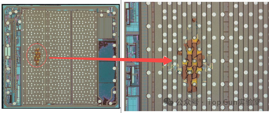 在排除外部因素后,我们对芯片进行了开盖(Decapsulation)操作,并使用光学显微镜(OM)进行内部检查。