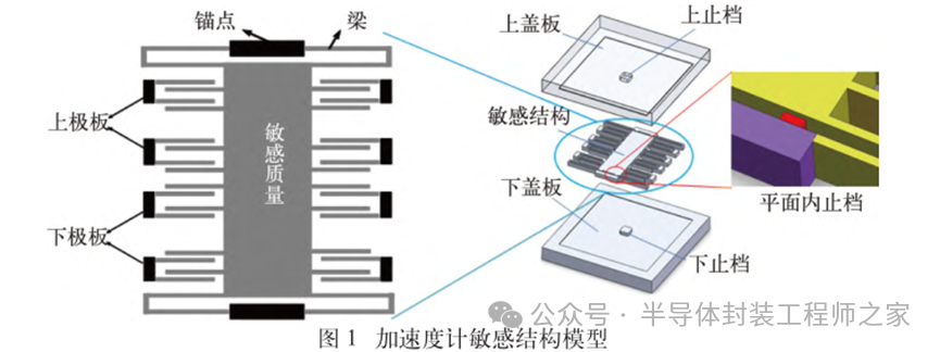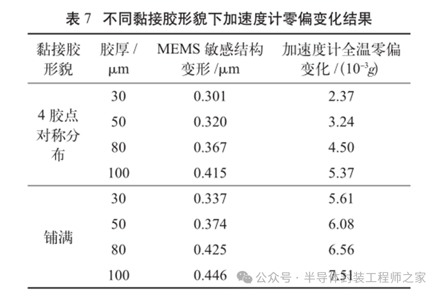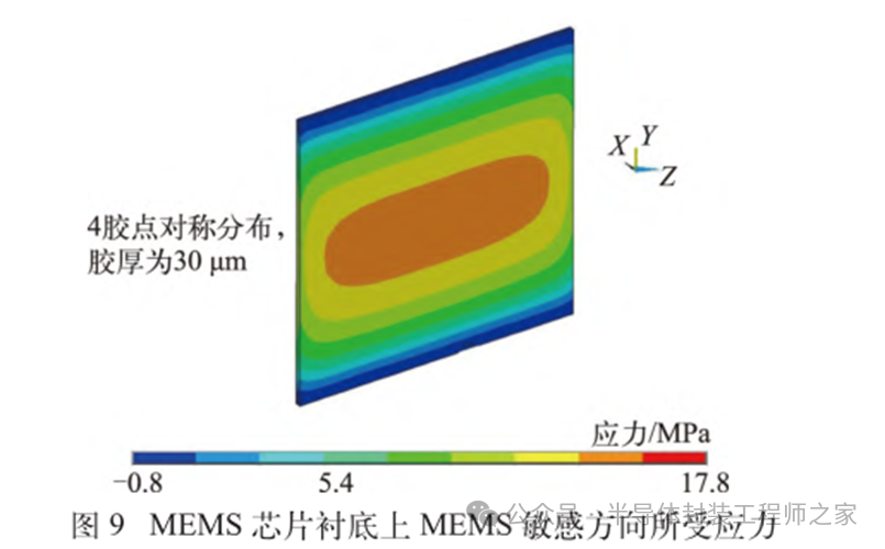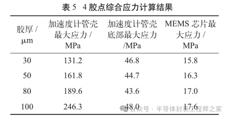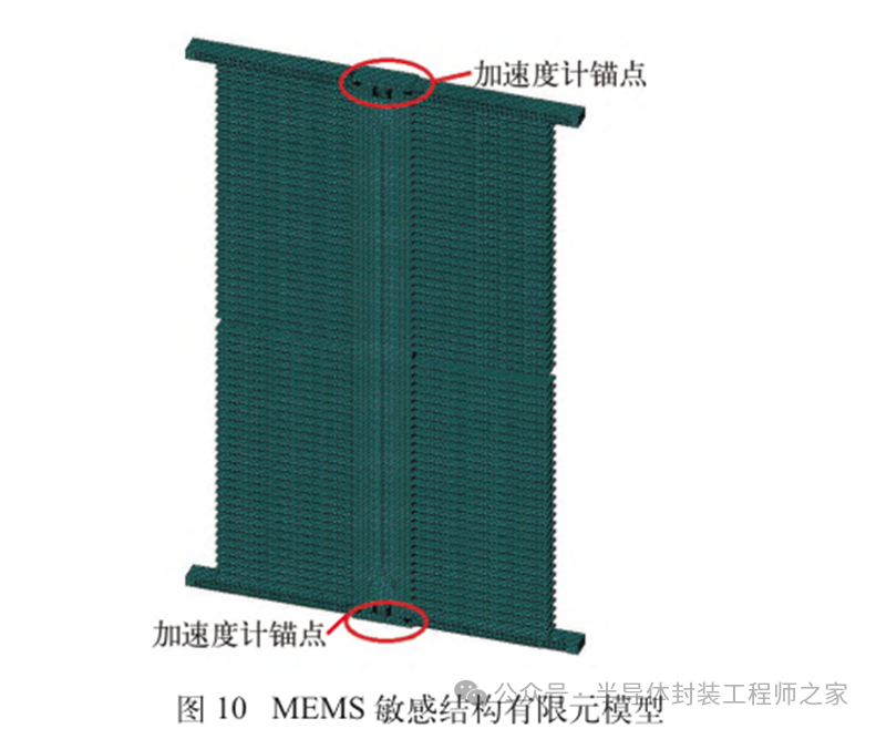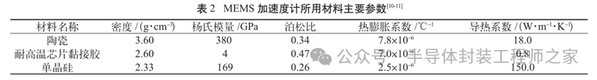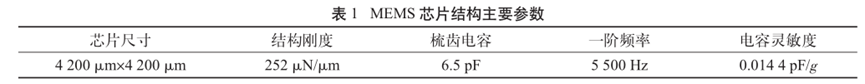 耐高温MEMS 加速度计设计及温度特性优化摘要: 利用高温 SOI ASIC 制造工艺和微机电系统 (MEMS) 技术,研制了更宽温区 (-55~225 ℃)的耐高温 MEMS 加速度计,拓宽了 MEMS 加速度计的使用范围。并对高温环境下的 MEMS 加速度计的温度特性进行研究。影响加速度计零偏温度系数的主要因素是应力,在应力过大的情况下,MEMS 加速度计的结构会发生形变,导致零位偏移、温度漂移过大。基于有限元分析,从高温加速度计封装入手,通过优化封装应力,提高 MEMS 加速度计的温度性能,将全温零偏变化量减小至0.002 5g 以内。加速度计量程达到了±50g,满量程线性度优于 0.3%,可以满足航空航天、石油钻井等各种复杂高温环境的应用要求。 0 引言 微机电系统(MEMS)是将机械、电子、光学及其他一些功能元件集成在单芯片或多个芯片上,能够对声、光、电、热、磁、运动等自然信息进行感知、识别、控制和处理的微型系统[1]。MEMS 加速度计具有成本低、体积小、可靠度高、易于批量生产等优点。常见的MEMS 加速度计工作温度为-55~85 ℃,无法满足更高温工作环境的应用需求。耐高温加速度计的典型应用环境包括钻井勘探、深井测振、航空航天等,部分装备的电子器件需要工作在超高温的环境中[2-5],工作温度至少为 200 ℃。目前国内耐高温类型的传感器主要为压力传感器,在航空、航天、国防、能源开发等领域有着广阔的应用需求。耐高温 MEMS 压力传感器主要以硅(Si)基压力传感器为主,利用绝缘体上硅(SOI)技术,实现耐高温加速度计的制作[6]。国外 AD 公司推出一款-40~175 ℃的耐高温 MEMS 加速度计 ADXL206,量程为±5g,其工作温度也未能达到上述航空航天等应用需求。本文针对耐高温 MEMS 加速度计展开研究,在完成其设计与加工的基础上,进一步提出了封装优化方案。高温加速度计的封装难点在于常规有机材料在超过 200 ℃的环境下易老化分解[7],导致可靠性显著下降。此外,在 MEMS 加速度计的生产加工过程中,材料性能易受工艺及外界条件影响,致使器件结构内部产生应力,最终影响加速度计全温区性能。而影响加速度计温度性能的主要因素是材料膨胀系数不匹配[7]和封装应力[8]。通过有限元分析手段[9],对高温加速度计的封装工艺进行了优化,尤其是芯片黏接胶的形貌和厚度等;对热应力和安装应力进行仿真分析,从而合理地控制、改善加速度计的温度特性。利用耐高温的陶瓷封装搭配平行缝焊的封装工艺,提高了耐高温加速度计的可靠性。 1 加速度计敏感结构及 ASIC 电路 1.1 MEMS 加速度计敏感结构 加速度计敏感结构模型如图 1 所示。开环工作方式下,支撑梁提供的弹性力与加速度产生的惯性力相平衡,平面运动的微机械加速度计的敏感结构可以等效为质量块-弹簧-阻尼二阶系统,XY 轴 MEMS 加速度计原理如图 2 所示,其动力学方程为 其中 M 为敏感结构的质量,D 为芯片内部封装气体阻尼系数,K 为弹簧刚度,x 为质量块相对于被测对象的位移,a 为被测对象的加速度。 ![]() 平面轴加速度计的检测电极采用变间隙电容形式,可以最大程度增加结构电容检测灵敏度。由于变间隙电容的尺寸比带梳齿结构的变面积电容小很多,在相同芯片面积条件下可以分布更多的电容对数。 变间隙差分电容检测灵敏度 ΔC 为 其中 A 为电容极板面积,ε 为介电常数,d0 为初始电容间隙,n 为检测电容对数。 加速 度 计设 计 量 程 覆 盖 5g~200g,本 文 以 50g为 例 进 行 阐 述 。满 量程 线 性 度 < 0.3 % ,结构 工作频 率 5500 Hz。 MEMS 芯片 结 构 主 要 参 数 如 表 1所示。 1.2 耐高温 ASIC 电路 基于高温 SOI 工艺平台完成了ASIC 电路设计及加工,该芯片能在-55~225 ℃高温环境中持续工作。图3 为 ASIC 芯片系统框图。 2 加速度计封装设计及优化 2.1 加速度计封装方案 耐高温加速度计采用陶瓷封装,如图 4 所示,MEMS 芯片 和 ASIC 芯片采用 叠 层 封装 ,MEMS 在下,ASIC 在上。MEMS与陶瓷管壳之间通过硅垫片过渡,可以提高两者的热膨胀系数匹配度。芯片黏接选择耐高温黏接胶。整个产品体系中,陶瓷管壳、黏接胶、键合金丝、MEMS 芯片、ASIC 芯片均采用耐高温设计,满足产品-55~225 ℃的温度使用范围要求。 ASIC 和 MEMS 芯片均 采 用 SOI 工 艺 ,能 满 足-55~225 ℃的工作温度范围。采用的某型号黏接胶玻璃化转变温度和工作温度均大于 250 ℃,因此在该封装体系中,高温加速度计的工作温度可以满足 225 ℃的要求。耐高温加速度计利用陶瓷管壳进行密封处理,内部填充高纯氮气,即使在 225 ℃的高温环境中,也能防止金属的氧化失效。 2.2 加速度计封装优化 加速度计是对应力敏感的器件,MEMS 的压力敏感结构为梳齿电容结构(见图 1),可动极板容易受到应力的影响产生变形,导致加速度计的电容发生变化,从而产生零偏变化。无论是外部的安装应力还是内部的热应力都会对 MEMS 敏感结构的电极施加应力,导致加速度计零偏变化。外部应力可通过金属壳体传递到加速度计陶瓷管壳上,再通过陶瓷管壳传递到内部的 MEMS 芯片上。加速度计本身的封装材料产生的热应力会直接作用到 MEMS 芯片上,使敏感结构产生变形,导致加速度计零偏变化,不同温度下的热应力变形反映到加速度计 指 标 上 即零偏变化量。 2.2.1 装配应力仿真 加速度计的工作温度高,需对加速度计的封装进行优化,利用有限元分析的手段,通过模拟不同的胶水形貌、胶水厚度,选择一种温度性能