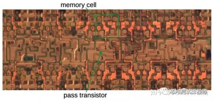 MOSFET的结构 下面的裸片照片特写显示了在显微镜下晶体管的外观。多晶硅栅极是两个掺杂硅区域之间的蛇形线。 FPGA中的MOSFET 6比特流和配置存储 XC2064 中的配置信息存储在配置内存单元中。FPGA 的内存不是使用 RAM 块进行存储,而是分布在 160×71 网格中的芯片上,确保每个位都位于它控制电路旁边。下图显示了配置比特流如何加载到 FPGA 中。比特流被送入从芯片中心(粉红色)向下运行的移位寄存器中。将 71 位加载到移位寄存器中后,列选择电路(蓝色)将选择特定的内存列,并并行加载到此列中。然后,将接下来的 71 位加载到移位寄存器中,左侧的下一列将成为所选列。此过程将重复 FPGA 的所有 160 列,将整个比特流加载到芯片中。使用移位寄存器可避免大量内存寻址电路。 比特流如何加载到 FPGA 中 重要的是,比特流的分布与文件中的分布完全相同:比特流文件中的比特布局与芯片上的物理布局匹配。如下所示,每个位都存储在FPGA控制电路的旁边。因此,比特流文件格式直接由硬件电路的布局确定。例如,当由于缓冲电路而在FPGA切片之间存在间隙时,相同的间隙会出现在位流中。比特流的内容不是围绕字段,数据表或配置块之类的软件概念来设计的。了解比特流取决于从硬件角度而非软件角度进行思考。如下所示实现配置存储器的每一位。每个存储单元均包含两个以环路连接的反相器。该电路具有两个稳定状态,因此可以存储一个位:顶部反相器为1,底部反相器为0,反之亦然。为了写入该单元,左侧的传输晶体管被激活,使数据信号通过。数据线上的信号只会使逆变器过载,从而写入所需的位。(您也可以使用相同的路径从FPGA中读取配置数据。)Q和反相Q输出控制FPGA中所需的功能,例如关闭路由连接,为查找表提供位,或控制锁存器电路。(在大多数情况下,仅使用Q输出。) 从数据表中显示一个位配置内存的示意图。Q 是输出,Q 是倒置输出。 下图显示了存储单元的物理布局。左图显示了八个存储单元,其中一个单元高亮显示。每条水平数据线馈入该行中的所有存储单元。每列选择行选择该列中的所有存储单元以进行写入。中间照片放大了一个存储单元的硅和多晶硅晶体管。 7查找表多路复用器 如前所述,FPGA通过使用查找表来实现任意逻辑功能。下图显示了如何在XC2064中实现查找表。左侧的八个值存储在八个存储单元中。四个多路复用器根据A 输入值选择每对值中的一个 。如果 A 为0,则选择最高值;如果 A 为1,则选择最低值。接下来,较大的多路复用器根据B 和 选择四个值之一 C。在这种情况下,结果是所需的值 A XOR B XOR C。通过在查找表中放置不同的值,可以根据需要更改逻辑功能。 使用查找表实现 XOR 每个多路复用器都是通过晶体管来实现的。根据控制信号,其中一个传递晶体管被激活,将该输入传递到输出。下图显示了LUT电路的一部分,多路复用了其中的两个比特。右边是两个存储器单元。每一个比特都要经过一个反相器进行放大,然后经过中间的多路复用器的传递晶体管,选择其中的一个比特。 LUT实现中的电路特写8锁存器 每个CLB包含一个触发器,允许FPGA实现锁存器,状态机和其他有状态电路。下图显示了触发器的实现。它使用主/辅助设计。当时钟为低电平时,第一个多路复用器让数据进入主锁存器。当时钟变高时,多路复用器关闭第一个锁存器的环路,并保持该值。(该位通过“或”门,“与非”门和反相器两次反转,因此保持不变。)同时,当时钟变高时,辅助锁存器的多路复用器从第一个锁存器接收该位(请注意,时钟已反转)。该值成为触发器的输出。当时钟变低时,次级的多路复用器关闭环路,从而锁存该位。因此,触发器是边缘敏感的,在时钟的上升沿锁存该值。置位和复位线强制触发器为高电平或低电平。 触发器的实现,箭头指出了第一个多路复用器和两个OR-NAND门 98-pin 交换矩阵 交换矩阵是一个重要的路由元件。每个开关有八个"引脚"(每侧两个),几乎可以连接任意引脚组合在一起。这允许信号比单个路由节点更灵活地转动、拆分或交叉。下图显示了四个 CLB (cyan)之间的路由网络的一部分。交换矩阵(绿色)可与右侧连接的任意组合连接。请注意,每个引脚可以连接到其他 7 个引脚中的 5 个。例如,引脚 1 可以连接到引脚 3,但无法连接到引脚 2 或 4。这使得矩阵几乎是一个横栏,有20个潜在的连接,而不是28个。 基于Xilinx 可编程门阵列数据手册,图7b 开关矩阵由一排传输晶体管实现,该传输晶体管由上方和下方的存储单元控制。晶体管的两侧是可以通过该晶体管连接的两个开关矩阵引脚。因此,每个开关矩阵具有20个相关联的控制位。 每个图块两个矩阵产生每个图块40个控制位的矩阵。下图显示了其中一个存储单元,该存储单元连接到下面的传输晶体管的长弯曲栅极。该晶体管控制引脚5和引脚1之间的连接。 因此,与该存储单元相对应的位流中的位控制引脚5和引脚1之间的开关连接。同样,其他存储单元及其相关晶体管控制其他开关连接。请注意,这些连接的顺序不遵循特定的模式。因此,位流位和开关引脚之间的映射是随机的。 10输入路由 CLB的输入在位流中使用不同的编码方案,这由硬件实现方式解释。在下图中,八个圆圈的节点是CLB框DD的潜在输入。 最多只能将一个节点配置为输入,因为将两个信号连接到同一输入将使它们短路。使用多