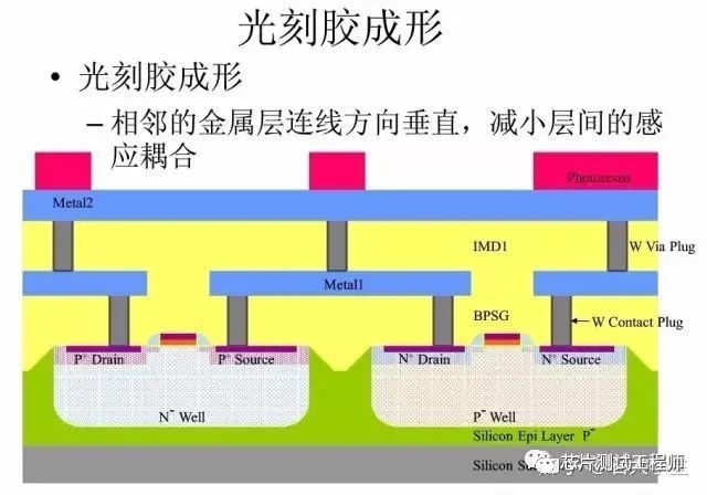 14. Metal-2的淀积及Metal-2的光刻、刻蚀、去胶: (1)Metal-2淀积: (2)Metal-2光刻刻蚀 15. 钝化层淀积及钝化层光刻、刻蚀、去胶:敦化刻蚀后一般要做一步alloy。 对于高级一点的工艺,可能会有更多层的metal,做法类似,继续Via和Metal的堆叠即可。 |