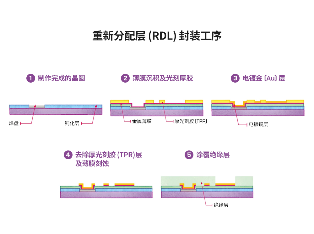 封装完整晶圆晶圆级封装是指晶圆切割前的工艺。晶圆级封装分为扇入型晶圆级芯片封装(Fan-In WLCSP)和扇出型晶圆级芯片封装(Fan-Out WLCSP),其特点是在整个封装过程中,晶圆始终保持完整。除此之外,重新分配层(RDL)封装、倒片(Flip Chip)封装及硅通孔1(TSV)封装通常也被归类为晶圆级封装,尽管这些封装方法在晶圆切割前仅完成了部分工序。不同封装方法所使用的金属及电镀(Electroplating)2绘制图案也均不相同。不过,在封装过程中,这几种方法基本都遵循如下顺序。 1 硅通孔(TSV , Through-Silicon Via): 一种可完全穿过硅裸片或晶圆实现硅片堆叠的垂直互连通道。 2 电镀 (Electroplating): 一项晶圆级封装工艺,通过在阳极上发生氧化反应来产生电子,并将电子导入到作为阴极的电解质溶液中,使该溶液中的金属离子在晶圆表面被还原成金属。 完成晶圆测试后,根据需求在晶圆上制作绝缘层(Dielectric Layer)。初次曝光后,绝缘层通过光刻技术再次对芯片焊盘进行曝光。然后,通过溅射(Sputtering)3工艺在晶圆表面涂覆金属层。此金属层可增强在后续步骤中形成的电镀金属层的黏附力,同时还可作为扩散阻挡层以防止金属内部发生化学反应。此外,金属层还可在电镀过程中充当电子通道。之后涂覆光刻胶(Photoresist)以形成电镀层,并通过光刻工艺绘制图案,再利用电镀形成一层厚的金属层。电镀完成后,进行光刻胶去胶工艺,采用刻蚀工艺去除剩余的薄金属层。最后,电镀金属层就在晶圆表面制作完成了所需图案。这些图案可充当扇入型WLCSP的引线、重新分配层封装中的焊盘再分布,以及倒片封装中的凸点。下文将对每道工序进行详细介绍。 3 溅射 (Sputtering): 一项利用等离子体束对靶材进行物理碰击,使靶材粒子脱落并沉积在晶圆上的工艺。 ▲图1:各类晶圆级封装工艺及相关步骤 光刻工艺:在掩模晶圆上绘制电路图案光刻对应的英文是Photolithography,由“-litho(石刻)”和“graphy(绘图)”组成,是一种印刷技术,换句话说,光刻是一种电路图案绘制工艺。首先在晶圆上涂覆一层被称为“光刻胶”的光敏聚合物,然后透过刻有所需图案的掩模,选择性地对晶圆进行曝光,对曝光区域进行显影,以绘制所需的图案或图形。该工艺的步骤如图2所示。 ▲图2:光刻工艺步骤 在晶圆级封装中,光刻工艺主要用于在绝缘层上绘制图案,进而使用绘制图案来创建电镀层,并通过刻蚀扩散层来形成金属线路。 ▲图3:摄影与光刻的对比 为更加清楚地了解光刻工艺,不妨将其与摄影技术进行比较。如图3所示,摄影以太阳光作为光源来捕捉拍摄对象,对象可以是物体、地标或人物。而光刻则需要特定光源将掩模上的图案转移到曝光设备上。另外,摄像机中的胶片也可类比为光刻工艺中涂覆在晶圆上的光刻胶。如图4所示,我们可以通过三种方法将光刻胶涂覆在晶圆上,包括旋涂(Spin Coating)、薄膜层压(Film Lamination)和喷涂(Spray Coating)。涂覆光刻胶后,需用通过前烘(Soft Baking)来去除溶剂,以确保粘性光刻胶保留在晶圆上且维持其原本厚度。 如图5所示,旋涂将粘性光刻胶涂覆在旋转着的晶圆中心,离心力会使光刻胶向晶圆边缘扩散,从而以均匀的厚度分散在晶圆上。粘度越高转速越低,光刻胶就越厚。反之,粘度越低转速越高,光刻胶就越薄。对于晶圆级封装而言,特别是倒片封装,光刻胶层的厚度须达到30 μm至100 μm,才能形成焊接凸点。然而,通过单次旋涂很难达到所需厚度。在某些情况下,需要反复旋涂光刻胶并多次进行前烘。因此,在所需光刻胶层较厚的情况下,使用层压方法更加有效,因为这种方法从初始阶段就能够使光刻胶薄膜达到所需厚度,同时在处理过程中不会造成晶圆浪费,因此成本效益也更高。但是,如果晶圆结构表面粗糙,则很难将光刻胶膜附着在晶圆表面,此种情况下使用层压方法,会导致产品缺陷。所以,针对表面非常粗糙的晶圆,可通过喷涂方法,使光刻胶厚度保持均匀。 ▲图4:光刻胶涂覆的三种方法 ![]() ▲图5:旋涂方法示意图 完成光刻胶涂覆和前烘后,接下来就需要进行曝光。通过照射,将掩模上的图案投射到晶圆表面的光刻胶上。由于正性光刻胶(Positive PR)在曝光后会软化,因此使用正性光刻胶时,需在掩模去除区开孔。负性光刻胶(Negative PR)在曝光后则会硬化,所以需在掩模保留区开孔。晶圆级封装通常采用掩模对准曝光机(Mask Aligner) 4或步进式光刻机(Stepper)5作为光刻工艺设备。4 掩模对准曝光机(Mask Aligner): 一种将掩模上的图案与晶圆进行对准,使光线穿过掩模并照射在晶圆表面的曝光设备。 5 步进式光刻机(Stepper): 一种在工件台逐步移动时,通过开启和关闭快门控制光线以进行光刻的机器。 显影(Development)是一种利用显影液来溶解因光刻工艺而软化的光刻胶的工艺。如图6所示,显影方法可分为三种,包括:水坑式 显影(Puddle Development),将显影液倒入晶圆中心,并进行低速旋转;浸没式显影(Tank Development),将多个晶圆同时浸入显影液中;喷淋式显影(Spray Development),将显影液喷洒到晶圆上。图7显示了静态显影方法的工作原理。完成静态显影后,通过光刻技术使光刻胶形成所需的电路图案。 ▲图6:三种不同的显影方法 ▲图7:水坑式显影方法的工作原理 |