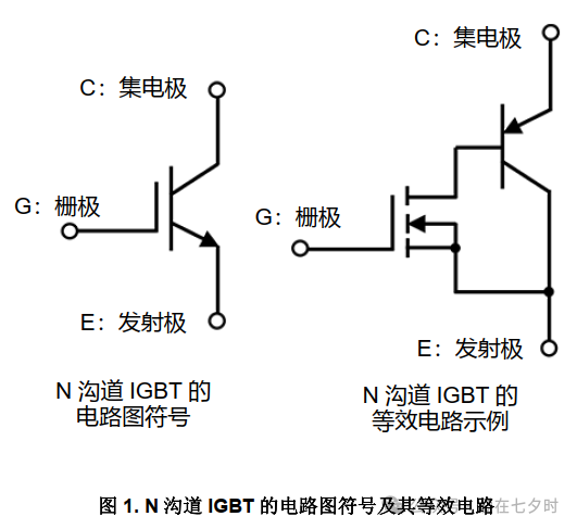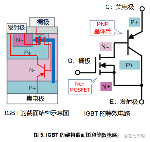 在解决“节能化”和“小型化”等全球面临的共同课题过程中,旨在以低功耗处理大功率的二极管和晶体管正在发挥着重要的作用,它们被统称为“功率器件”或“功率半导体”。其中,“IGBT”这种“绝缘栅双极晶体管”是具有代表性的功率器件之一,被广泛应用于包括电机驱动在内的众多领域。 在本文中,将介绍 IGBT 的基础知识,包括基于 IGBT 特点的适用范围和应用示意图、结构和工作原理、以及与其他功率器件的比较和区分使用等内容。一、 什么是 IGBT? IGBT 是“Insulated Gate Bipolar Transistor”的首字母缩写,中文名称是“绝缘栅双极晶体管”。IGBT 是由 MOSFET 和双极晶体管组成的复合器件,是同时具备这两种产品优点的功率晶体管。IGBT 有 N 沟道型和 P 沟道型两种,目前N 沟道型是主流产品。 下图 1 是 N 沟道 IGBT 的电路图符号及其等效电路。有些等效电路图会更详细一些,但这里为了便于理解,给出的是相对简单的示意图。包括结构在内,实际的产品会更复杂一些。有关结构等的详细内容后续会进行介绍。 添加图片注释,不超过 140 字(可选) IGBT具有栅极、集电极、发射极 3个引脚。栅极与MOSFET相同,集电极和发射极与双极晶体管相同。在 N 沟道型的情况下,IGBT 与 MOSFET 一样,通过电压控制元件给栅极施加相对于发射极的正电压时,集电极-发射极之间导通,流过集电极电流。其工作原理和驱动方法会另行介绍。 前面已经介绍过,IGBT 是兼备 MOSFET 和双极晶体管优点的晶体管。MOSFET 由于栅极是被隔离(绝缘)的,因此具有输入阻抗高、开关速度较快的优点,但其缺点是在高电压时导通电阻较高。双极晶体管即使在高电压条件下导通电阻也很低,但存在输入阻抗低和开关速度慢的缺点。而 IGBT 则是弥补了这两种器件各自的缺点的晶体管,具有输入阻抗高、开关速度快*、即使在高电压条件下也能实现低导通电阻的特点。 *开关速度比 MOSFET 慢,但比双极晶体管快。 IGBT 和 MOSFET 等功率器件根据应用产品的使用条件和需求,物善其用,比如在高电压应用中使用 IGBT,在低电压应用中则使用 MOSFET,被区分使用在与其特性相适合的应用中。 二、 IGBT 的适用范围 IGBT 和 MOSFET 等功率元器件应根据其特点物善其用。此外,功率器件除了以器件单品(分立半导体)的形式使用外,将器件与其他基本部件组合在一起的“模块”应用范围也很广泛。下图 2 是从输出容量和工作(开关)频率的角度出发绘制的 IGBT、Si MOSFET、SiC MOSFET 和双极晶体管的适用范围。另外,还对分立产品和模块的适用范围进行了区分。 添加图片注释,不超过 140 字(可选) IGBT 分立产品覆盖 1kHz~50、60kHz 的频率范围、稍高于 1kVA 的输出容量范围。对于 IGBT 模块而言,根据与其他部件的组合等情况,工作频率上限程度相同,但输出容量范围可高达 100MVA 以上。随着输出容量的增加,工作频率会因为开关损耗等的限制而降低。通过这张图,应该可以对每种功率器件的特点和适用范围有一个整体印象。 三、 使用了 IGBT 的应用产品 从 IGBT 和其他功率器件的输出容量和工作频率的角度介绍了它们各自的适用范围。本章将介绍 IGBT的适用范围和应用产品之间的关系。 下图 3 从输出容量和工作频率的角度,列出了 IGBT 分立产品和模块及 Si MOSFET 分立产品的适用范围,以及在适用范围内的适用应用产品示例。适用范围与第 2 章中给出的范围是一样的,图中列出了相应范围内的具体应用产品。 添加图片注释,不超过 140 字(可选) 从图中可以看出,有些应用产品在重叠范围中,但在处理高电压大电流的电车和 HEV/EV 领域,主流产品还是 IGBT模块。分立式 IGBT 和 Si MOSFET 在家电和小型工业设备等应用中的需求很大,主要根据工作频率方面的优点来区分使用。 四、 IGBT 的结构 IGBT 是由 MOSFET 和双极晶体管组成的复合器件,是同时具备这两种产品优点的功率晶体管。下面以目前主流的 N 沟道 IGBT 为例,来介绍 IGBT的基本结构。这之后只用“IGBT”描述的基本上都是指 N 沟道 IGBT。 为了便于理解 IGBT 半导体的结构,下图4 带我们回顾一下电路图符号、简单的等效电路以及 IGBT 的基本工作。 添加图片注释,不超过 140 字(可选) IGBT 具有栅极、集电极、发射极 3 个引脚。可以认为,其栅极与 MOSFET 的栅极相同,其集电极和发射极与双极晶体管相同。在 N 沟道 IGBT 的情况下,IGBT 与 MOSFET一样,通过电压控制元件给栅极施加相对于发射极的正电压 VGE 时,集电极-发射极之间导通,流过集电极电流 IC。 下图 5 是 IGBT 半导体结构示意图(截面图)和等效电路图。为便于理解而进行了简化。蓝色箭头表示集电极电流 IC 的流动情况。可以与旁边的等效电路图比较来看。 添加图片注释,不超过 140 字(可选) 如上图 5 所示,在 Nch MOSFET 的漏极侧形成了 P+集电极层,从集电极到发射极是 P 型-N 型-P 型-N 型排列的结构。 等效电路图中的 Nch MOSFET 的漏极和 PNP 晶体管的基极都相当于 IGBT 的 N-漂移层。栅极是绝缘膜上的薄膜布线,Nch MOSFET 的栅极=IGBT 的栅极。IGBT 的发射极为 N+层,相当于 Nch MOSFET 的源极。PNP 晶体管的集电极为 P+,与 IGBT 的发射极 N+层相连接。PNP 晶体管的发射极是 P+层,相当于 IGBT 的集电极。虽然这些听起来有些复杂,但是如果将IGBT的结构用示意图体现出来,就很容易理解其等效电路图了。 五、 IGBT 的工作原理 下图 6 中的等效电路和结构截面图就是说明 IGBT的工作