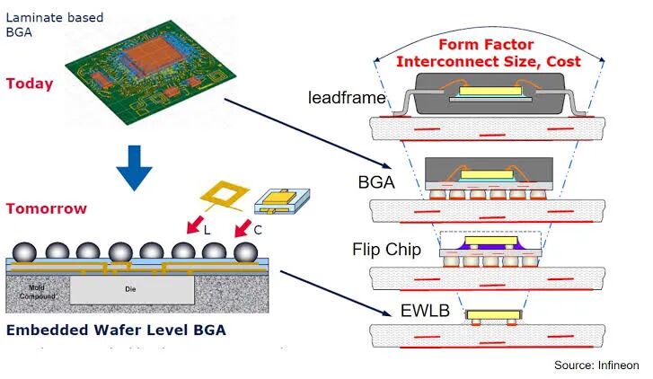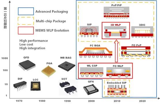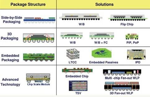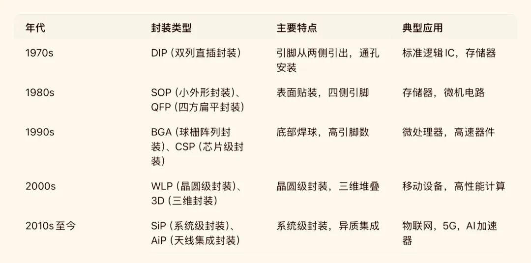 1 芯片封装的基本概念与核心作用 芯片封装,在半导体制造流程中属于后道工序,是指将经过测试的晶圆切割成单独的芯片(Die),并将其装配到封装外壳或基板上的全过程。 这一过程包括固定芯片、建立电气连接、密封保护等多个关键步骤。 封装技术不仅为芯片提供机械支撑和环境保护,同时还负责建立芯片与外部电路之间的电气连接和热管理路径。 从本质上看,封装是连接芯片内部微观世界与外部宏观电路的桥梁,对芯片的性能、可靠性、成本和适用场景都有着直接且深远的影响。 随着半导体技术的飞速发展,芯片封装已从简单的保护功能演变为影响系统性能的关键因素。当芯片制程节点进入纳米尺度后,封装技术的重要性愈加凸显,成为提升芯片整体性能的核心技术之一。 根据行业观察,封装技术的进步始终与芯片集成度的提升同步,当芯片晶体管数量从数千跃升至百亿级时,封装的引脚数也从最初的几十根增长至数千根,封装面积与芯片面积之比(封装效率)从10:1优化至接近1:1。 1.1 物理保护与机械支撑 芯片在其生命周期中可能面临多种物理和化学威胁。裸芯片(即未封装的芯片)本身相当柔嫩,易受机械外力损伤、环境湿度侵蚀、灰尘粒子污染以及化学腐蚀等危害。封装通过绝缘材料将集成电路裸片包裹起来,形成一道坚固的屏障,有效隔绝这些外部威胁。 具体而言,封装为芯片提供以下几方面的物理保护: · 环境保护:防止空气中的杂质对芯片电路造成腐蚀,避免电气性能下降。封装材料能阻挡水汽、盐雾和各种腐蚀性气体的侵入,确保芯片在复杂环境下仍能正常工作。 · 机械缓冲:通过封装使芯片的热膨胀系数与框架或基板的热膨胀系数相匹配,缓解由于热等外部环境的变化而产生的应力以及芯片自身发热而产生的应力。这种热机械保护能防止因材料间热膨胀系数不匹配导致的芯片损坏或失效。 · 应力防护:吸收外部冲击和振动,防止芯片在安装、运输和使用过程中因物理应力而损坏。封装材料的选择和结构设计都需考虑对各类应力的缓冲和分散。 1.2 电气连接与性能优化 封装提供了从芯片微观世界到印刷电路板宏观世界的电气连接桥梁。芯片上的焊盘尺寸极为微小,通常以微米为单位,而印刷电路板上的线路尺寸则以毫米为单位,封装实现了这两者之间的尺寸过渡和间距转换。 电气连接功能具体表现在以下几个方面: · 间距转换:封装的尺寸调整功能将芯片的极细引线间距(现代芯片已达亚微米级别)调整到实装基板的尺寸间距,便于实装操作。例如,从以0.13μm以下为特征尺寸的芯片,到以10μm为单位的芯片焊点,再到以100μm为单位的外部引脚,最后到以毫米为单位的印刷电路板,都是通过封装来实现的。 · 信号完整性:通过优化布线长度和阻抗配比,尽可能地降低连接电阻、寄生电容和电感,保证正确的信号波形和传输速度。在高频应用中,封装结构对信号完整性的影响尤为显著,优良的封装设计能减少信号衰减和串扰。 · 电源分配:为芯片提供稳定、低噪声的电源分配系统。随着芯片功耗的增加,封装的电源分配网络设计变得至关重要,需确保到达芯片的电源电压干净稳定,电压降控制在允许范围内。 1.3 热管理功能 芯片在工作过程中会产生大量热量,若不能及时散去,会导致结温升高,性能下降,甚至彻底失效。封装作为芯片与外部环境之间的热流通路,其散热能力直接关系到芯片的可靠性和寿命。 封装的热管理功能主要包括: · 热传导路径:通过封装基板和外壳,将芯片产生的热量传导至印刷电路板或散热器。封装材料的热导率直接影响散热效率。 · 散热增强:基于散热的要求,封装越薄越好。当芯片功耗大于2W时,在封装上需要增加散热片或热沉片,以增强其散热冷却功能;5~10W时必须采取强制冷却手段。 · 热匹配:通过选择合适的热膨胀系数材料,减少芯片与封装结构之间的热应力,防止因温度循环导致的疲劳失效。 1.4 标准规格化与兼容性 封装提供了标准化的外形尺寸和引脚规划,使不同制造商生产的芯片能够互换使用,大大提高了电子系统设计的灵活性和生产效率。 规格化的具体优势包括: · 安装兼容:封装的尺寸、形状、引脚数量、间距、长度等有标准规格,既便于加工,又便于与印刷电路板相配合。 · 制造效率:标准化的封装使相关的生产线及生产设备都具有通用性,这对于封装用户、电路板厂家、半导体厂家都很方便。 · 测试便利:标准化封装便于自动化测试和安装,提高了生产效率和产品质量一致性。 2 芯片封装的主要形式与演进 芯片封装技术经历了数十年的发展,形成了多种各具特色的封装形式,以满足不同应用场景的需求。 从最初的双列直插式封装(DIP)到现在的球栅阵列封装(BGA)、芯片级封装(CSP)乃至系统级封装(SiP),封装技术始终朝着更高密度、更佳性能和更小尺寸的方向发展。 表:主要封装类型演进历程 2.1 传统封装形式 2.1.1 双列直插式封装(DIP) DIP(Dual In-line Package)是最早普及的插装型封装之一,引脚从封装两侧引出,呈直线排列,引脚中心距为标准2.54mm。DIP封装主要采用塑料或陶瓷作为封装材料,引脚数通常从6到64不等。 DIP封装的主要特点包括: · 结构简单,适合手工安装和维修; · 机械强度高,能承受较大的物理应力; · 引脚间距大,便于PCB线路设计制作; · 体积较大,不适用于高密度安装场景。 由于DIP封装的这些