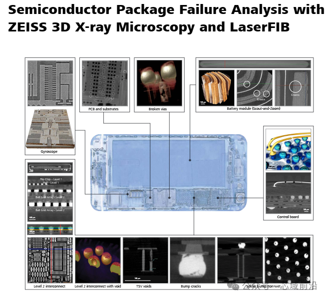 这张表综合了 Sony 的FA流程资料、SGS 的方法分类、Jim Colvin 的FA教程,以及 Thermo Fisher、Bruker 的器件分析资料。 ![]() 01FA不是“把芯片切开”,而是先把问题问对 一颗芯片失效,表面上可能只是“功耗偏高”“不启动”“某个接口失灵”或者“通过老化后突然漏电”。 但在FA工程师眼里,这些都只是外在表现。 真正重要的是:它是稳定漏电还是偶发异常,是热相关还是时序相关 ,是电压一升就坏还是特定工作模式才坏。 Jim Colvin 的教程里提到,I-V特性实际上是选择后续分析路线的重要依据:线性响应更适合热方法,非线性问题往往更容易在光发射类方法里出现信号。 也就是说,FA第一步不是“拆”,而是“先把故障性格摸清楚”。 Sony 给出的通用流程也非常典型:先理解失效信息,再确认并复现失效现象,接着判定失效模式,之后才进入失效位置隔离,最后再做物理分析并形成报告。 这个顺序看似啰嗦,其实非常关键——因为一旦你在没有定位的情况下盲目去层、抛光或切截面,等于在一个本来就极小的嫌疑区域里又主动“抹掉现场”。 FA最怕的,不是找不到,而是把本来能找到的证据亲手破坏掉。 ![]() 02先不拆:无损方法是FA里最像“医学影像科”的部分 现代FA的一个核心原则是: 能不破坏,就先不破坏。 因为封装一旦被打开、金属一旦被去掉、介质层一旦被刻蚀,原始失效状态就可能改变。所以很多分析会先从无损方法入手。 X-ray与3D XRM 最常见的一类是 X-ray(X射线)与 3D XRM(X-ray Microscopy,X射线显微成像)。 它们特别适合看封装级问题,比如焊线断裂、焊线偏移、焊点空洞、die attach(芯片贴装)异常、内部裂纹等。 Matsusada 的资料提到,在树脂封装后,细至20到30微米量级的焊线已经无法通过肉眼直接观察,只能依赖高分辨率X射线系统; ZEISS 的封装FA资料则说明,3D X-ray可以把一系列二维投影重建成三维体数据,实现数字化“虚拟切片”,在不真正切开器件的情况下查看内部结构。 C-SAM 第二类是 C-SAM(Confocal Scanning Acoustic Microscopy,共焦扫描声学显微镜)。 如果说 X-ray 更像“透视骨骼”,那 C-SAM 更像在找“层间脱粘”。 它利用声波在不同材料界面的反射差异,去识别封装内部的分层、空洞、die crack(芯片裂纹)、underfill(底部填充)空洞、bump(凸点)异常等问题。 Sage 的说明很直接:C-SAM 是一种非破坏、非侵入式方法,尤其适合在进入破坏性步骤之前,先确认这些界面缺陷是否原本就存在。 对封装分析来说,这一步很重要,因为它可以帮助区分“产品本来就坏了”与“样品在后续处理里被弄坏了”。 LIT 第三类是LIT(Lock-In Thermography,锁相热成像)。 Fraunhofer IISB 的资料显示,它通过给被测器件施加周期性激励,再用红外相机测量热响应的幅值和相位图,从而锁定电活性缺陷产生的热点。 短路、ESD(Electrostatic Discharge,静电放电)损伤、氧化层损伤、边缘终端缺陷、导电污染等,都可能在热图里露出马脚。 它的强项不是“看见金属长什么样”,而是“告诉你哪里在异常耗能”。在很多案例里,这一步恰恰是后续FIB截面的导航图。 ![]() 03给芯片“通上电”追凶:EFA是把坏点缩到足够小的关键一步 如果无损方法解决的是“里面可能哪里有问题”,那么 EFA(Electrical Failure Analysis,电性失效分析)解决的就是“哪一块区域真的在电学上不正常”。 EMMI 其中最经典的方法之一,是 EMMI(Emission Microscope,发光显微镜), 也常被称作 PEM(Photon Emission Microscopy,光子发射显微镜)。 它的原理并不神秘:当器件内部某些缺陷区域在偏压下发生电子—空穴复合、结击穿或局部高场效应时,会发出极其微弱的光; EMMI 用高灵敏度探测器把这种“失效微光”抓出来,再叠加到版图或显微图上,工程师就能看到热点在哪里。 iST 和 MA-tek 的公开说明都指出,EMMI 对 gate oxide(栅氧)缺陷、ESD失效、latch-up(闩锁)、junction leakage(结漏电)等特别有用,但对纯欧姆短路、金属短路,或者被大面积金属遮挡的埋藏点,效果可能有限。 OBIRCH 另一把“电学手电筒”是 OBIRCH(Optical Beam Induced Resistance Change,光束诱导电阻变化)。 iST 的定义非常清楚:它在器件功能测试期间,用激光从正面或背面扫描芯片,激光造成的局部温升会让异常区域的电阻变化比正常区域更明显,系统再把这种变化转成图像,定位可疑缺陷。 说得更直白一点,EMMI擅长“找会发光的异常”,OBIRCH更擅长“找受热后电阻反应异常的地方”。 很多不太发光、但有局部高阻、微短、漏电路径的故障,用 OBIRCH 反而更容易抓住。 为什么很多先进器件喜欢从背面做这些分析? Springer 的经典章节给了答案: 硅对红外光有相对透明性 ,因此背面访问在不少情况下更容易接近电活性区域,尤其当正面被多层金属和复杂互连遮挡时,这一点格外重要。 也正因为工艺越来越先进、金属层越来越复杂,背面分析的重要性这几年只会越来越高,不会下降。 ![]() 04真正剖开真相:PFA的本质,是把“怀疑”变成“证据” 当故障位置已经被缩小到足够小的范围,PFA(Physical Failure Analysis,物理失效分析)才真正登场。 这个阶段才是很多人想象中的“把芯片拆开看”。 但严格来说,它不是粗暴拆解,而是 带着定位信息的精密手术 。 开盖与逐层去层 PFA通常从 decap(开盖)开始。 Sony 的资料提到,针对常见树脂封装,基本思路是通过化学方法去除封装树脂,暴露芯片表面。 拿到芯片表面后,很多故障还看不见,因为真正的问题可能